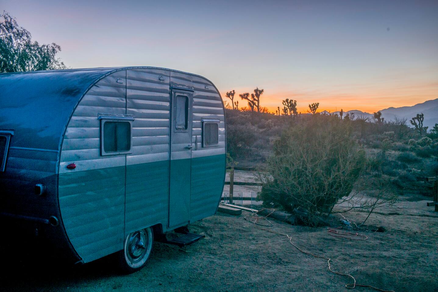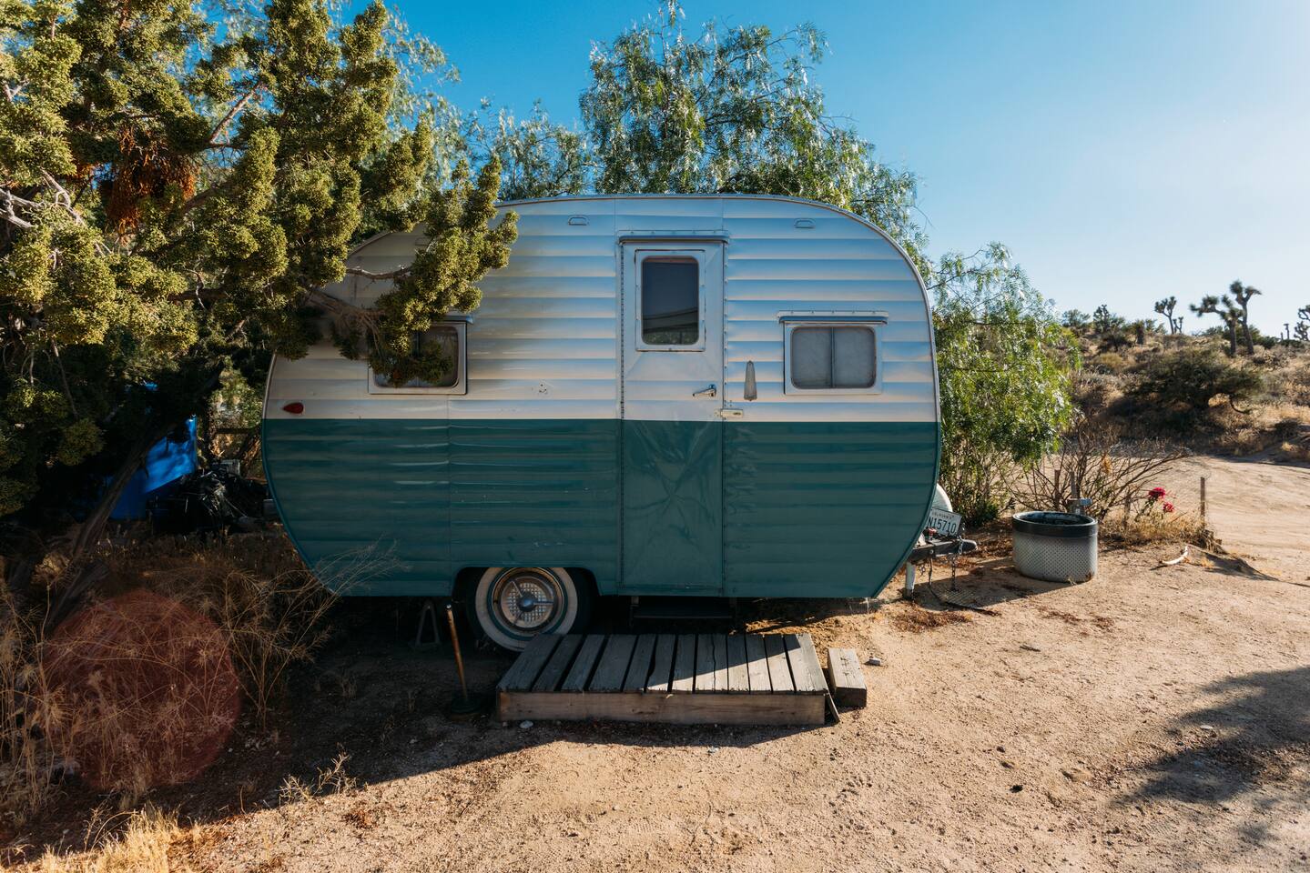 Tucked away 2 miles up a dirt road, this charming renovated 1955 “canned ham” trailer offers a cozy, nostalgic stay on a secluded 6-acre artist compound. Located near Pioneertown and Pappy & Harriet’s, it’s the perfect base for exploring—or simply staying put and soaking in the beauty. The trailer features a comfy bed, vintage charm, and access to an 80-foot shared swimming pool and hot tub (adults only; clothing optional). The vibe is creative, relaxed, and lightly communal.