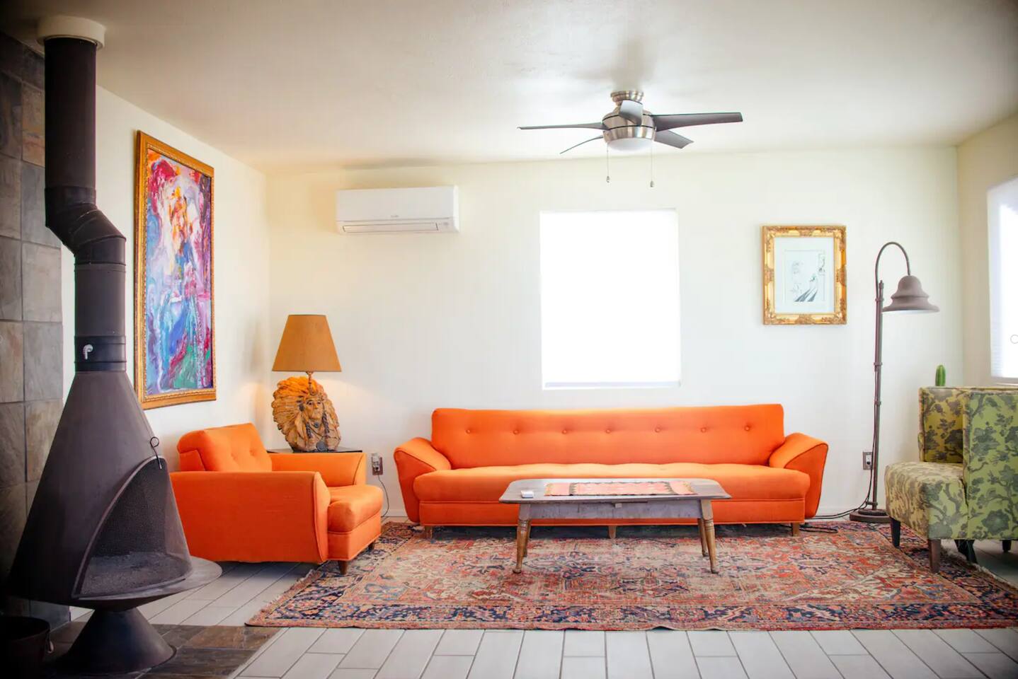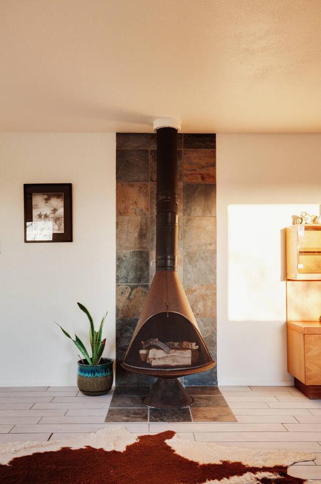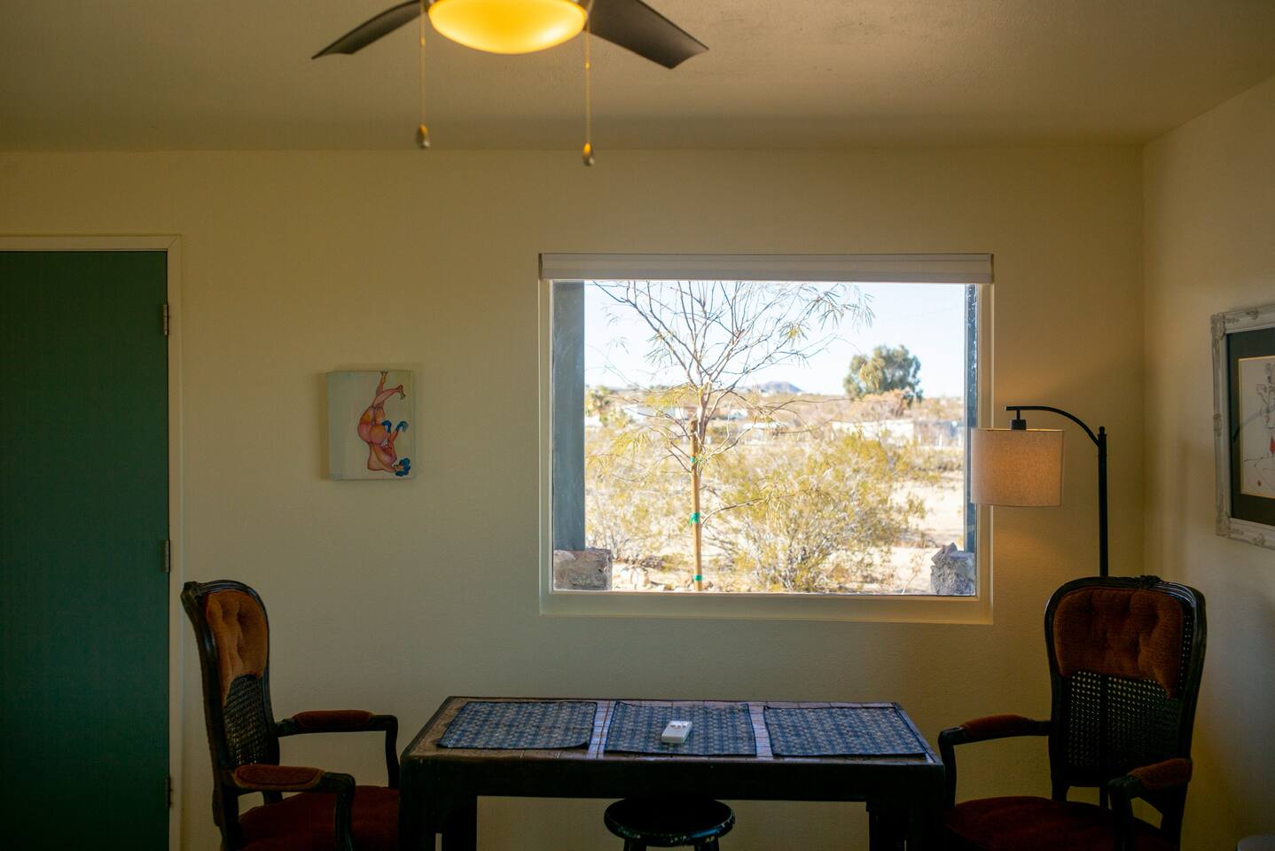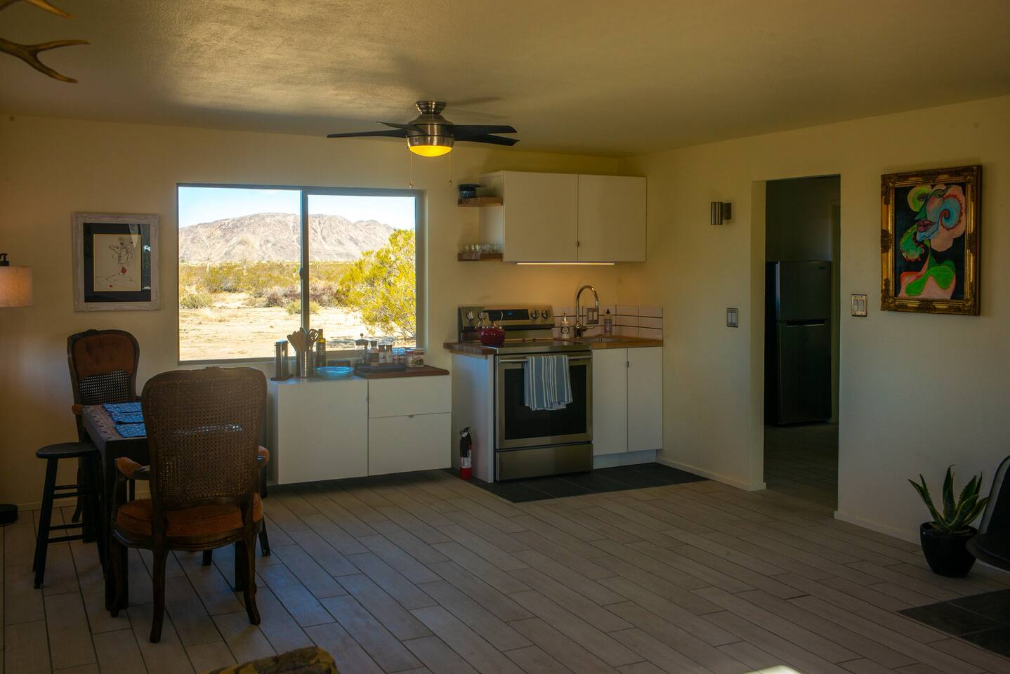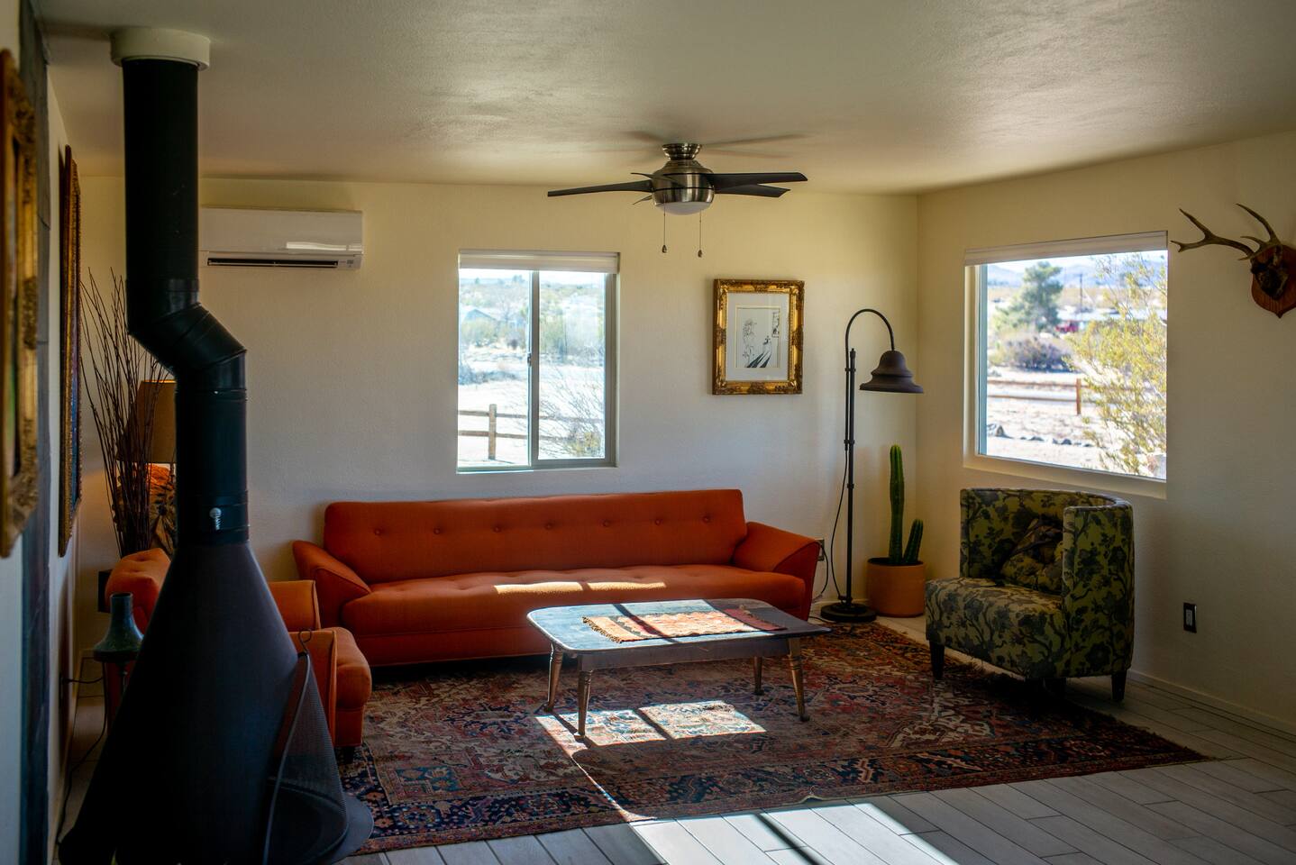 Nestled in the heart of Landers, this charming two-bedroom home offers a blend of rustic history and modern comfort. Each bedroom features a plush king-sized bed, and while the bathroom currently boasts a deep soaking tub, a full shower addition is on the horizon. Relax under the stars in the outdoor hot tub, gather around the firepit, or enjoy a meal prepared on the BBQ grill. Inside, the vintage Malm fireplace adds a cozy touch, complemented by curated artwork from local artist Keely King. This property isn't just a retreat; it's a piece of history. Originally a 1930s mining homestead, it later became the residence of George Van Tassel during the construction of the Integratron—a unique structure inspired by Tesla's theories and claimed extraterrestrial guidance. Explore the local attractions: Integratron: Experience the renowned sound baths in this acoustically perfect dome. Giant Rock: Visit the world's largest freestanding boulder, steeped in Native American lore and UFO history. Noah Purifoy Outdoor Desert Art Museum: Discover large-scale sculptures in an open-air setting. Gubler Orchids: Tour this family-owned orchid nursery and learn about exotic plants. Whether you're seeking a peaceful desert escape or an exploration of Landers' unique attractions, this home provides the perfect base.