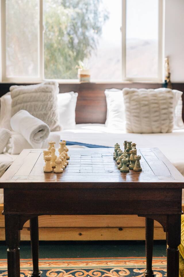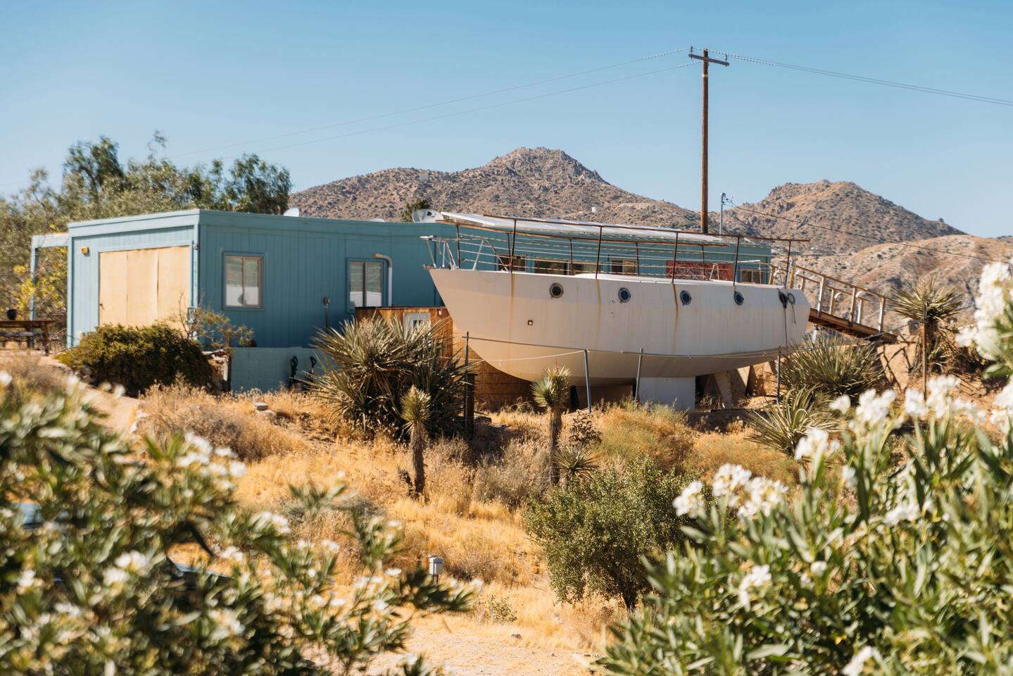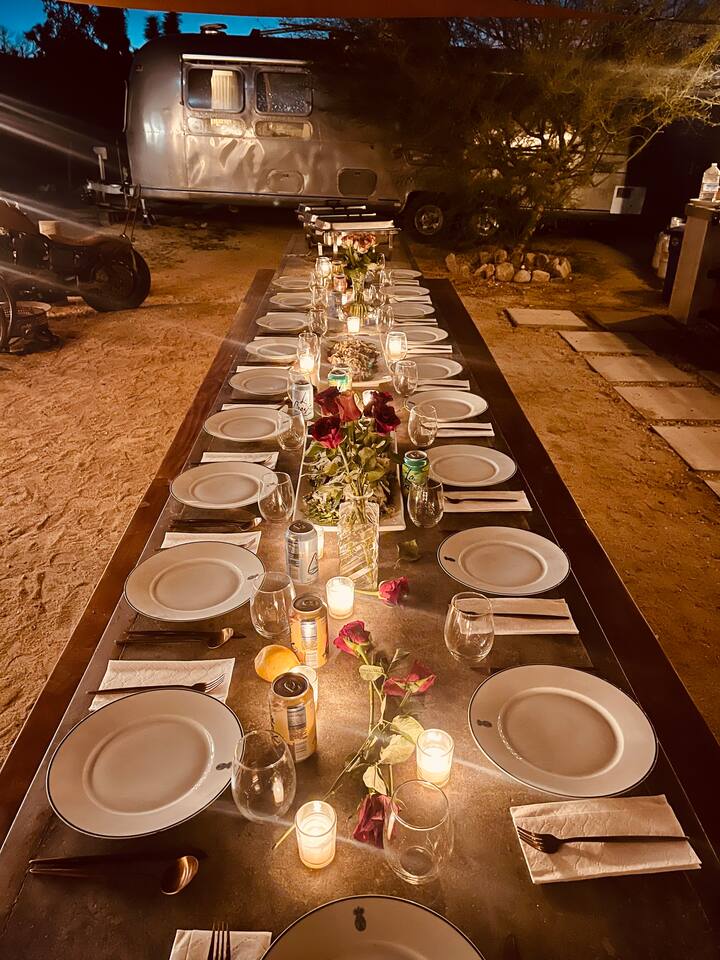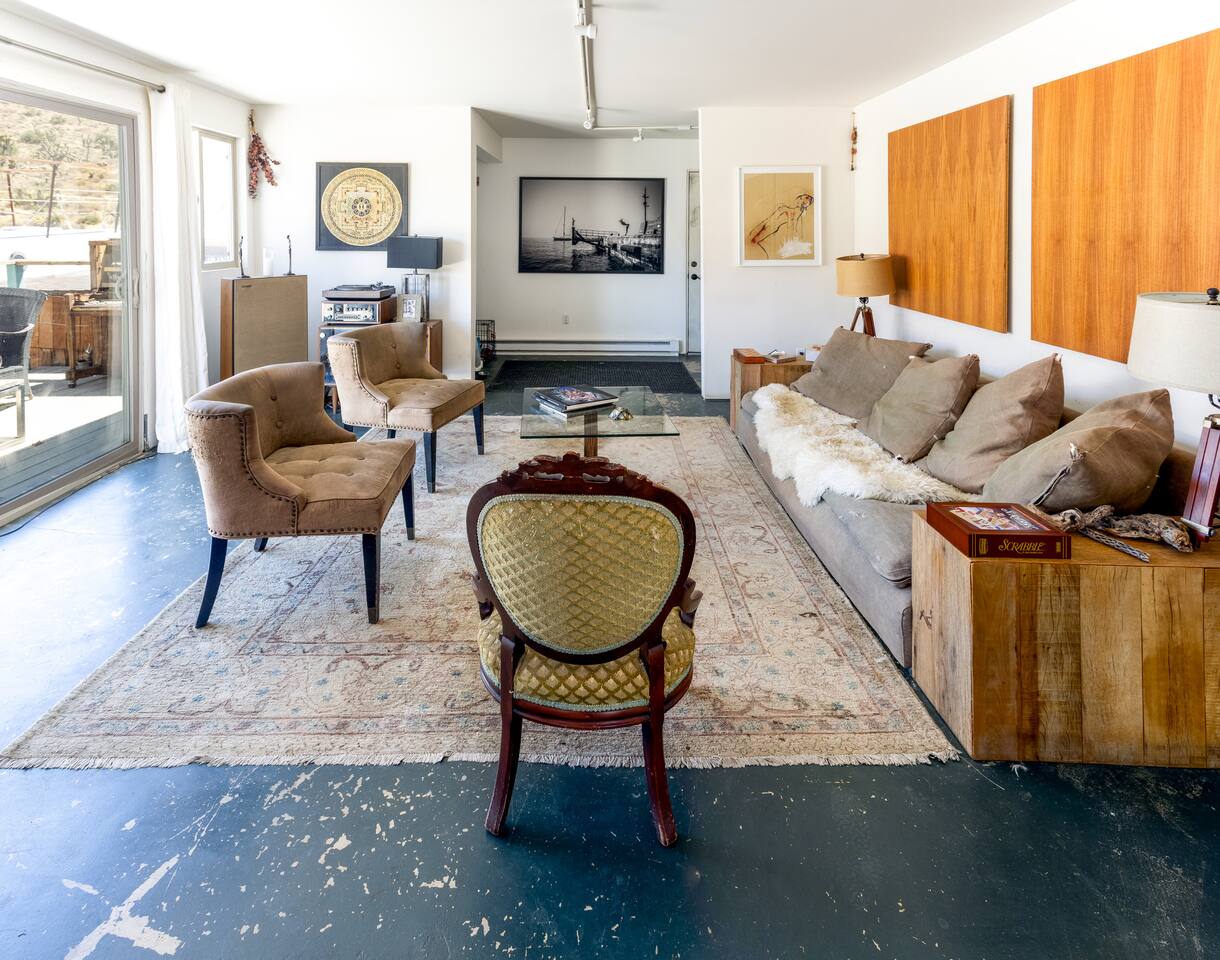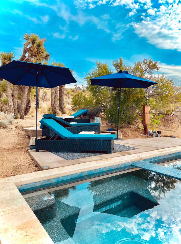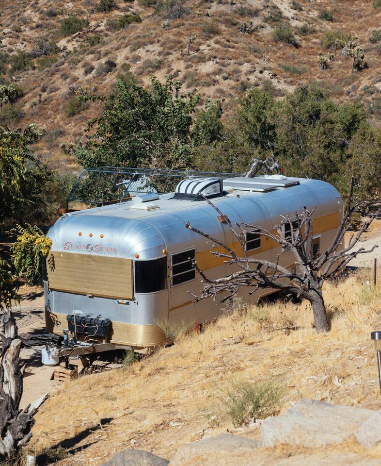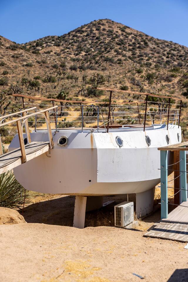 High Desert Protocol — A Secluded Creative Compound for Groups, Gatherings & Getaways Welcome to High Desert Protocol, a 6-acre sanctuary tucked into the hills above Yucca Valley—just a short drive from Pioneertown, Joshua Tree National Park, and the iconic Pappy & Harriet’s. Designed for creative communion, private restoration, and unforgettable gatherings, the compound features three distinct homes, three beautifully restored vintage trailers, a converted shipping container art gallery/bedroom, and a converted boat.The Compound can comfortably sleep up to 19 guests (and more with advance notice). We just completed the newest addition to our property - the Quonset Hut. Designed as a large multipurpose event space, the Quonset Hut can host dinner parties, events, parties, screenings, performances, and more. The Quonset Hut adds an additional bathroom to the property with a massive two-headed concrete shower. Designed by a musician, the Quonset Hut is fully equipped as a recording studio. Musicians please inquire about using the recording facilities. Photos of the Quonset Hut coming soon. ✹ What You’ll Find Across the Property: - Three King Beds, plus additional single and full beds - Three Full Kitchens, including a fully-stocked outdoor kitchen with grill, griddle, and smoker - 80-foot Above-Ground Concrete Pool & Hot Tub (clothing optional) - Shaded Cabana Lounge with sun loungers - 9-Foot Grand Piano in the main house - Fire Pit (BYO wood, wind + weather permitting) - Hundreds of Acres of Pristine Public Land at your doorstep—ideal for hiking and stargazing THE SPACES ✹ The Main House (The Robin’s Egg) Master bedroom with king bed, soaking tub, and chef’s kitchen Guest room with two single beds and separate bathroom Large living room with 80-inch flatscreen TV and grand piano Indoor/outdoor dining areas Recently painted a vibrant, inviting green (updated photos coming soon!) ✹ Vintage Canned Ham Trailer Located beside the main house Sleeps 1 in a twin bed Warm and nostalgic, equipped with space heater ✹ The Boat Behind the house One of the most popular sleep spots on the compound Outfitted with full bed + A/C (sleeps two) ✹ The Library Standalone structure with a king bed, massive soaking tub, private kitchen, custom concrete shower Immaculate interior design, perfect for lovers, thinkers, and solitude-seekers ✹ 1955 Spartan Trailer Features a full bed, private bathroom, and kitchenette ✹ Silverstreak Trailer Cozy full bed and desert views ✹ Converted Shipping Container Now a climate-controlled gallery/bedroom, complete with swamp cooler for A/C ✹ Vixen Vintage trailer. ✹ The Pool The compound’s 80-foot pool and jacuzzi are ideal for laps, sunbathing, or quiet sunset soaks. The energy is relaxed and clothing optional. Most guests go nude in the hot tub—it’s kept warm every evening. ✹ The Vibe We’ve built this space with care, over time. It’s a place of freedom, ease, creativity, and connection—with nature and each other. Many of our dearest friends were once Airbnb guests. Others come here and seek complete privacy. We honor both. This is an adults-only property. No one under 18 is permitted. We allow small events and gatherings with prior permission—please reach out if you're planning something special. ✹ A Few Ground Rules: Please rinse off before entering the pool/hot tub (no oils or sunscreen) Be respectful, kind, and aware—of others and the land Fire pit use is permitted only when there’s no wind and weather is safe. Bring your own wood. We’re here if you have questions. Be sure to read the reviews—and we truly hope to welcome you to High Desert Protocol.