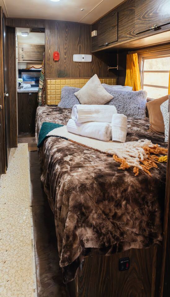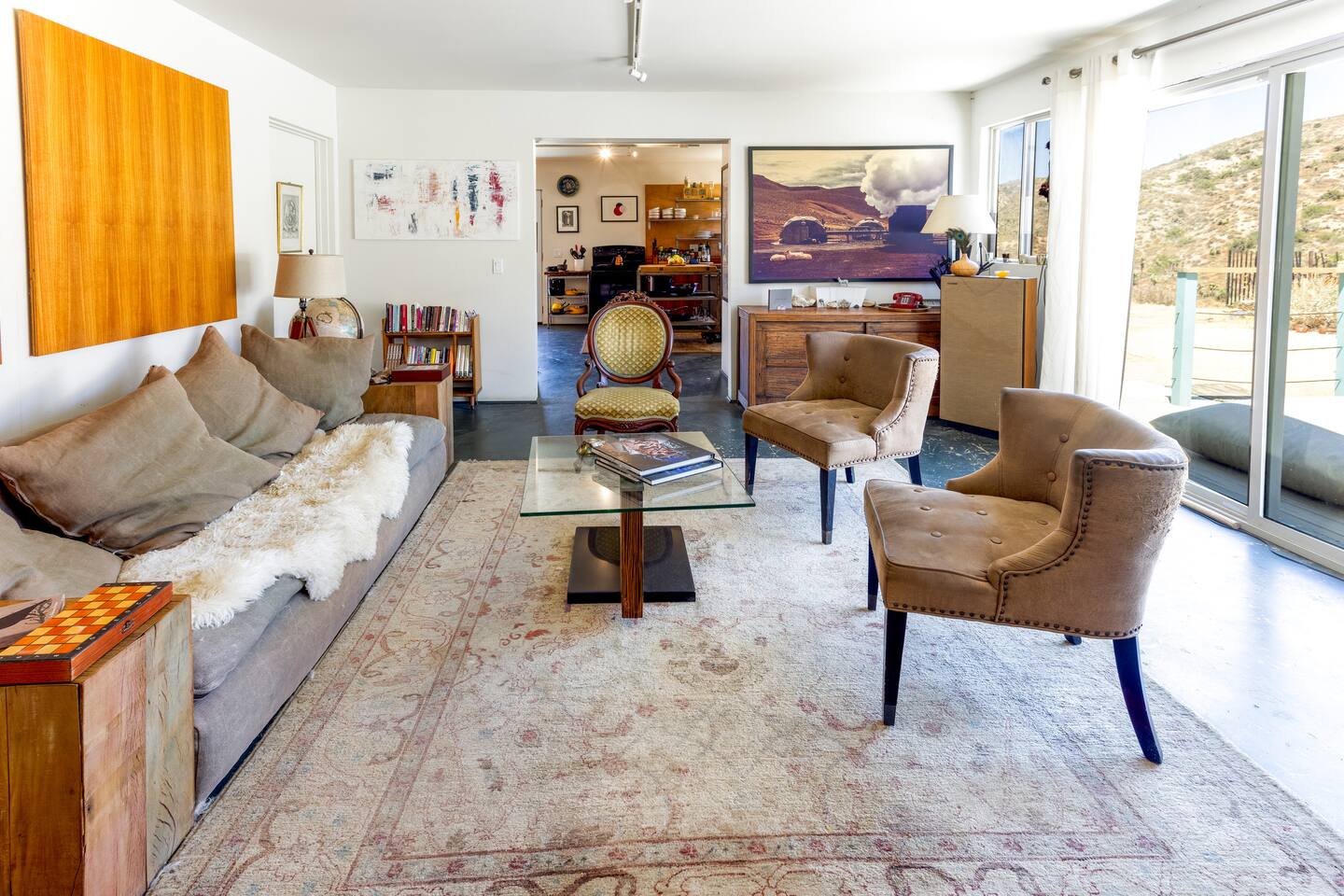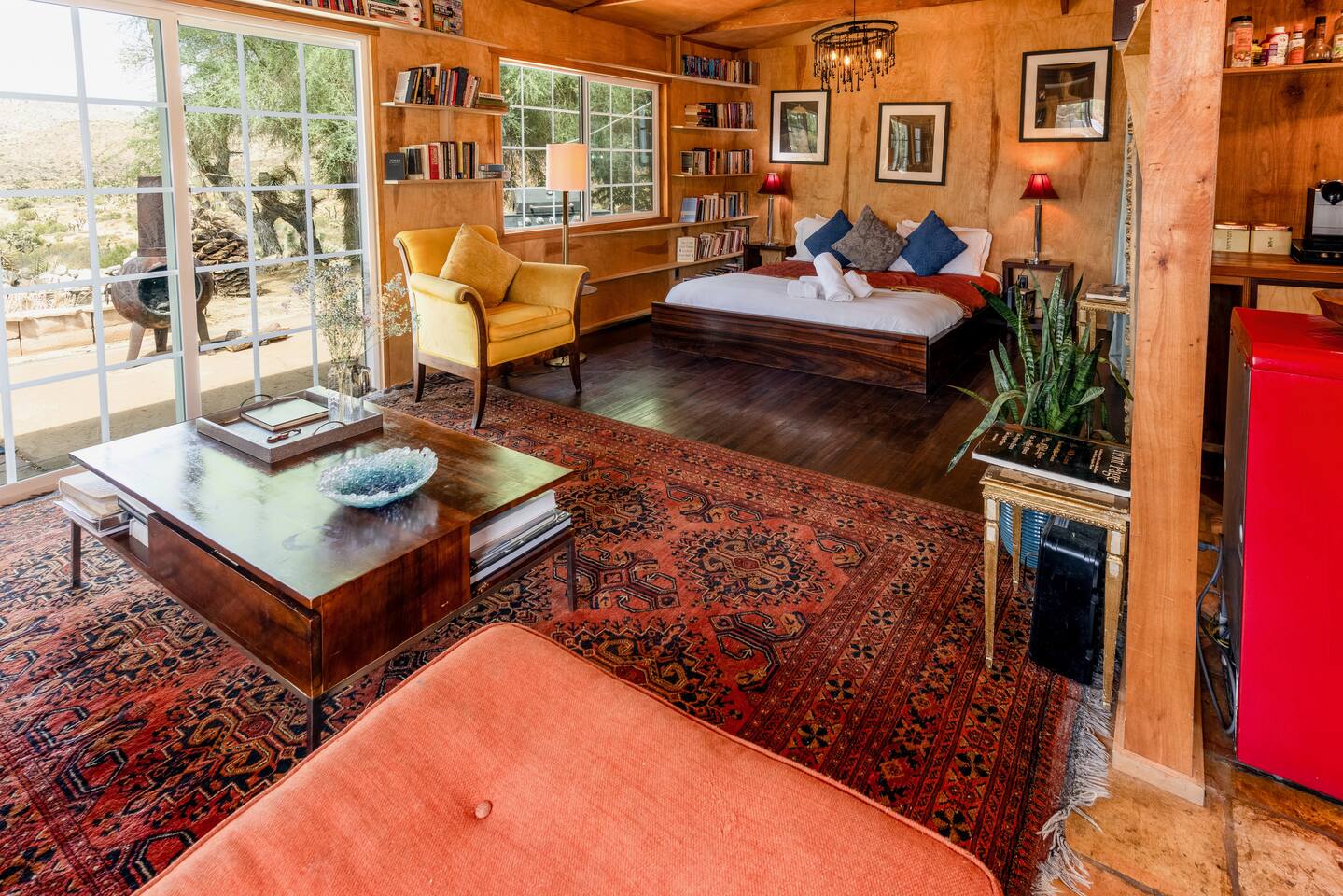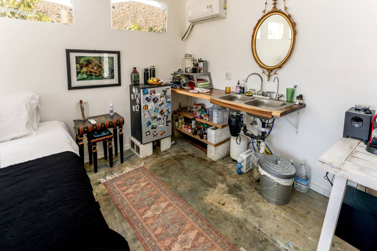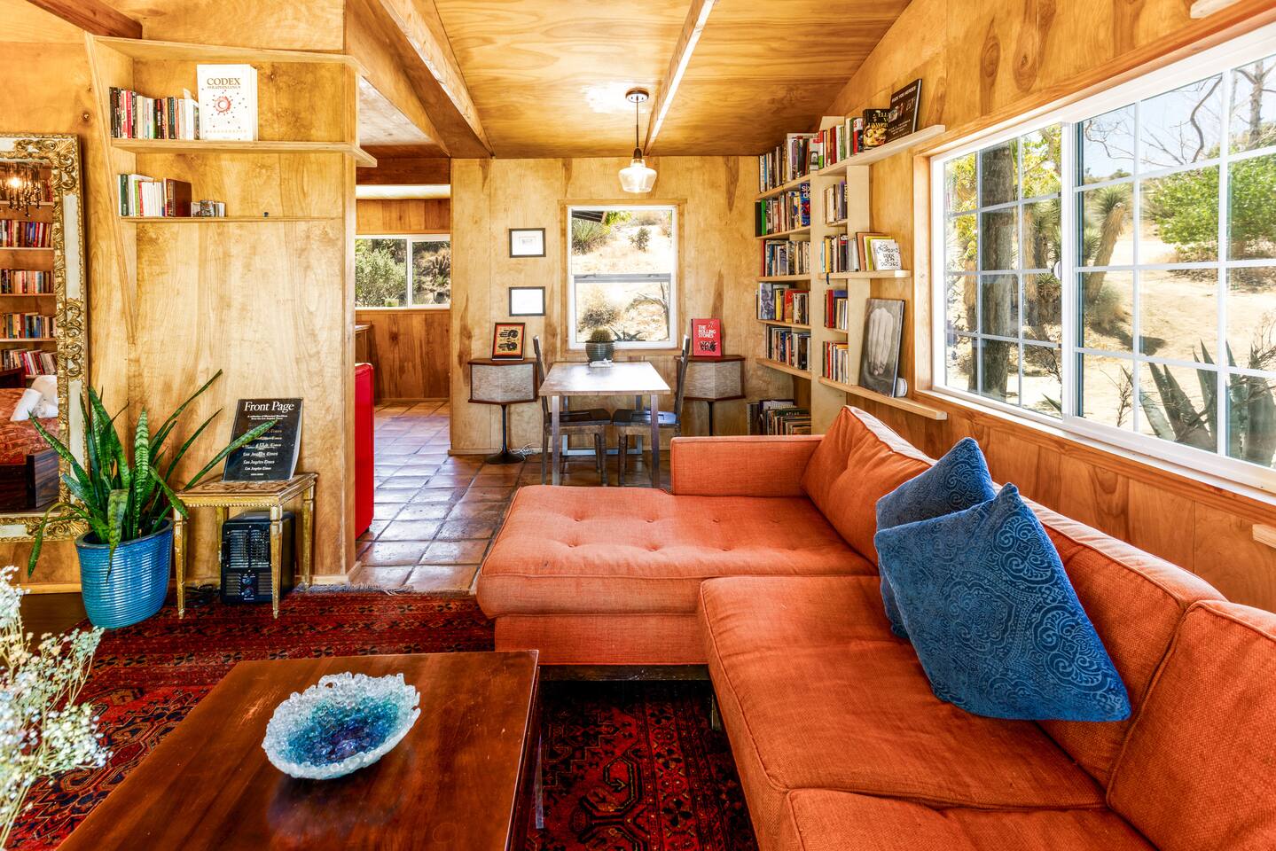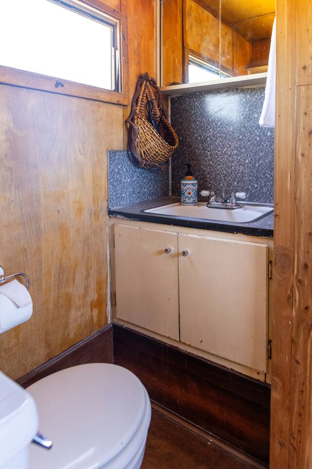 High Desert Protocol — A Secluded Creative Compound for Groups, Gatherings & Getaways Welcome to High Desert Protocol, a 6-acre sanctuary tucked into the hills above Yucca Valley—just a short drive from Pioneertown, Joshua Tree National Park, and the iconic Pappy & Harriet’s. Designed for creative communion, private restoration, and unforgettable gatherings, the compound features three distinct homes, three beautifully restored vintage trailers, a converted shipping container art gallery/bedroom, and a converted boat.The Compound can comfortably sleep up to 19 guests (and more with advance notice). We just completed the newest addition to our property - the Quonset Hut. Designed as a large multipurpose event space, the Quonset Hut can host dinner parties, events, parties, screenings, performances, and more. The Quonset Hut adds an additional bathroom to the property with a massive two-headed concrete shower. Designed by a musician, the Quonset Hut is fully equipped as a recording studio. Musicians please inquire about using the recording facilities. Photos of the Quonset Hut coming soon. ✹ What You’ll Find Across the Property: - Three King Beds, plus additional single and full beds - Three Full Kitchens, including a fully-stocked outdoor kitchen with grill, griddle, and smoker - 80-foot Above-Ground Concrete Pool & Hot Tub (clothing optional) - Shaded Cabana Lounge with sun loungers - 9-Foot Grand Piano in the main house - Fire Pit (BYO wood, wind + weather permitting) - Hundreds of Acres of Pristine Public Land at your doorstep—ideal for hiking and stargazing THE SPACES ✹ The Main House (The Robin’s Egg) Master bedroom with king bed, soaking tub, and chef’s kitchen Guest room with two single beds and separate bathroom Large living room with 80-inch flatscreen TV and grand piano Indoor/outdoor dining areas Recently painted a vibrant, inviting green (updated photos coming soon!) ✹ Vintage Canned Ham Trailer Located beside the main house Sleeps 1 in a twin bed Warm and nostalgic, equipped with space heater ✹ The Boat Behind the house One of the most popular sleep spots on the compound Outfitted with full bed + A/C (sleeps two) ✹ The Library Standalone structure with a king bed, massive soaking tub, private kitchen, custom concrete shower Immaculate interior design, perfect for lovers, thinkers, and solitude-seekers ✹ 1955 Spartan Trailer Features a full bed, private bathroom, and kitchenette ✹ Silverstreak Trailer Cozy full bed and desert views ✹ Converted Shipping Container Now a climate-controlled gallery/bedroom, complete with swamp cooler for A/C ✹ Vixen Vintage trailer. ✹ The Pool The compound’s 80-foot pool and jacuzzi are ideal for laps, sunbathing, or quiet sunset soaks. The energy is relaxed and clothing optional. Most guests go nude in the hot tub—it’s kept warm every evening. ✹ The Vibe We’ve built this space with care, over time. It’s a place of freedom, ease, creativity, and connection—with nature and each other. Many of our dearest friends were once Airbnb guests. Others come here and seek complete privacy. We honor both. This is an adults-only property. No one under 18 is permitted. We allow small events and gatherings with prior permission—please reach out if you're planning something special. ✹ A Few Ground Rules: Please rinse off before entering the pool/hot tub (no oils or sunscreen) Be respectful, kind, and aware—of others and the land Fire pit use is permitted only when there’s no wind and weather is safe. Bring your own wood. We’re here if you have questions. Be sure to read the reviews—and we truly hope to welcome you to High Desert Protocol.