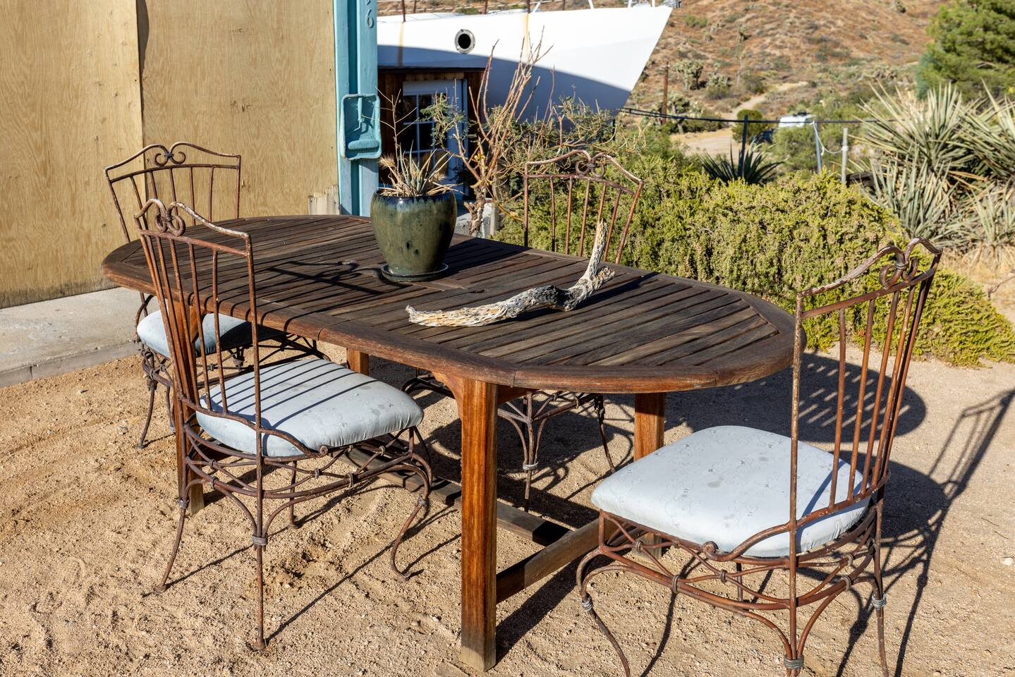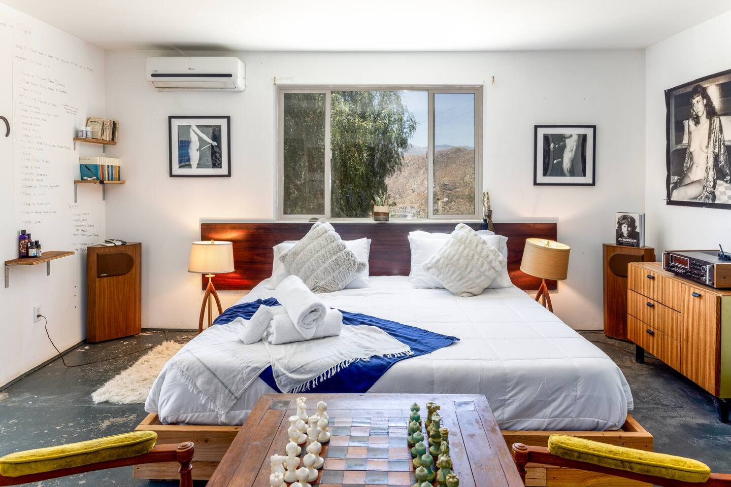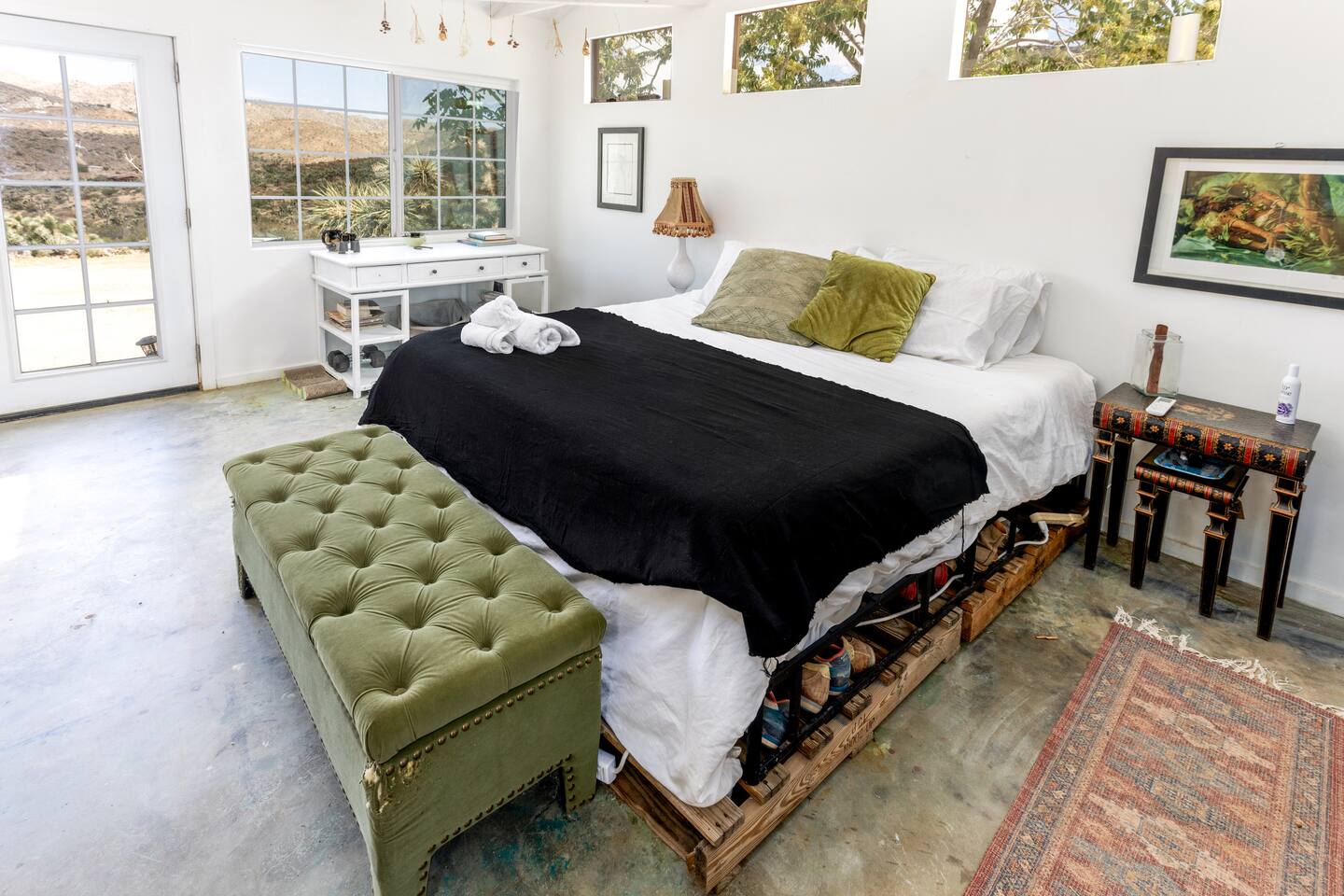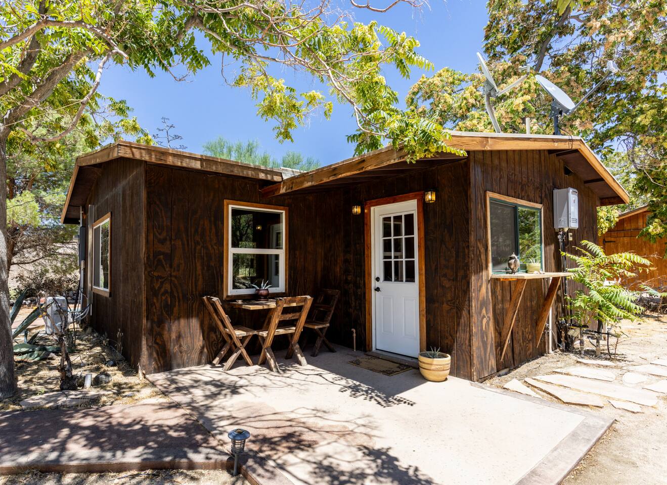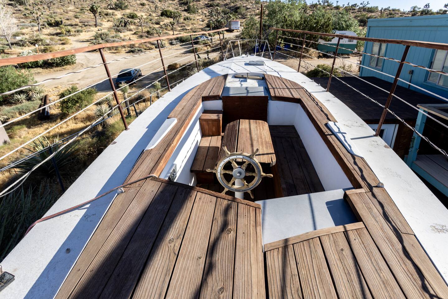 High Desert Protocol — A Secluded Creative Compound for Groups, Gatherings & Getaways Welcome to High Desert Protocol, a 6-acre sanctuary tucked into the hills above Yucca Valley—just a short drive from Pioneertown, Joshua Tree National Park, and the iconic Pappy & Harriet’s. Designed for creative communion, private restoration, and unforgettable gatherings, the compound features three distinct homes, three beautifully restored vintage trailers, a converted shipping container art gallery/bedroom, and a converted boat.The Compound can comfortably sleep up to 19 guests (and more with advance notice). We just completed the newest addition to our property - the Quonset Hut. Designed as a large multipurpose event space, the Quonset Hut can host dinner parties, events, parties, screenings, performances, and more. The Quonset Hut adds an additional bathroom to the property with a massive two-headed concrete shower. Designed by a musician, the Quonset Hut is fully equipped as a recording studio. Musicians please inquire about using the recording facilities. Photos of the Quonset Hut coming soon. ✹ What You’ll Find Across the Property: - Three King Beds, plus additional single and full beds - Three Full Kitchens, including a fully-stocked outdoor kitchen with grill, griddle, and smoker - 80-foot Above-Ground Concrete Pool & Hot Tub (clothing optional) - Shaded Cabana Lounge with sun loungers - 9-Foot Grand Piano in the main house - Fire Pit (BYO wood, wind + weather permitting) - Hundreds of Acres of Pristine Public Land at your doorstep—ideal for hiking and stargazing THE SPACES ✹ The Main House (The Robin’s Egg) Master bedroom with king bed, soaking tub, and chef’s kitchen Guest room with two single beds and separate bathroom Large living room with 80-inch flatscreen TV and grand piano Indoor/outdoor dining areas Recently painted a vibrant, inviting green (updated photos coming soon!) ✹ Vintage Canned Ham Trailer Located beside the main house Sleeps 1 in a twin bed Warm and nostalgic, equipped with space heater ✹ The Boat Behind the house One of the most popular sleep spots on the compound Outfitted with full bed + A/C (sleeps two) ✹ The Library Standalone structure with a king bed, massive soaking tub, private kitchen, custom concrete shower Immaculate interior design, perfect for lovers, thinkers, and solitude-seekers ✹ 1955 Spartan Trailer Features a full bed, private bathroom, and kitchenette ✹ Silverstreak Trailer Cozy full bed and desert views ✹ Converted Shipping Container Now a climate-controlled gallery/bedroom, complete with swamp cooler for A/C ✹ Vixen Vintage trailer. ✹ The Pool The compound’s 80-foot pool and jacuzzi are ideal for laps, sunbathing, or quiet sunset soaks. The energy is relaxed and clothing optional. Most guests go nude in the hot tub—it’s kept warm every evening. ✹ The Vibe We’ve built this space with care, over time. It’s a place of freedom, ease, creativity, and connection—with nature and each other. Many of our dearest friends were once Airbnb guests. Others come here and seek complete privacy. We honor both. This is an adults-only property. No one under 18 is permitted. We allow small events and gatherings with prior permission—please reach out if you're planning something special. ✹ A Few Ground Rules: Please rinse off before entering the pool/hot tub (no oils or sunscreen) Be respectful, kind, and aware—of others and the land Fire pit use is permitted only when there’s no wind and weather is safe. Bring your own wood. We’re here if you have questions. Be sure to read the reviews—and we truly hope to welcome you to High Desert Protocol.