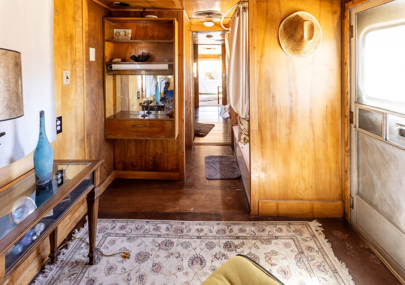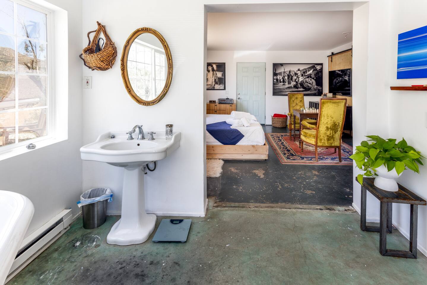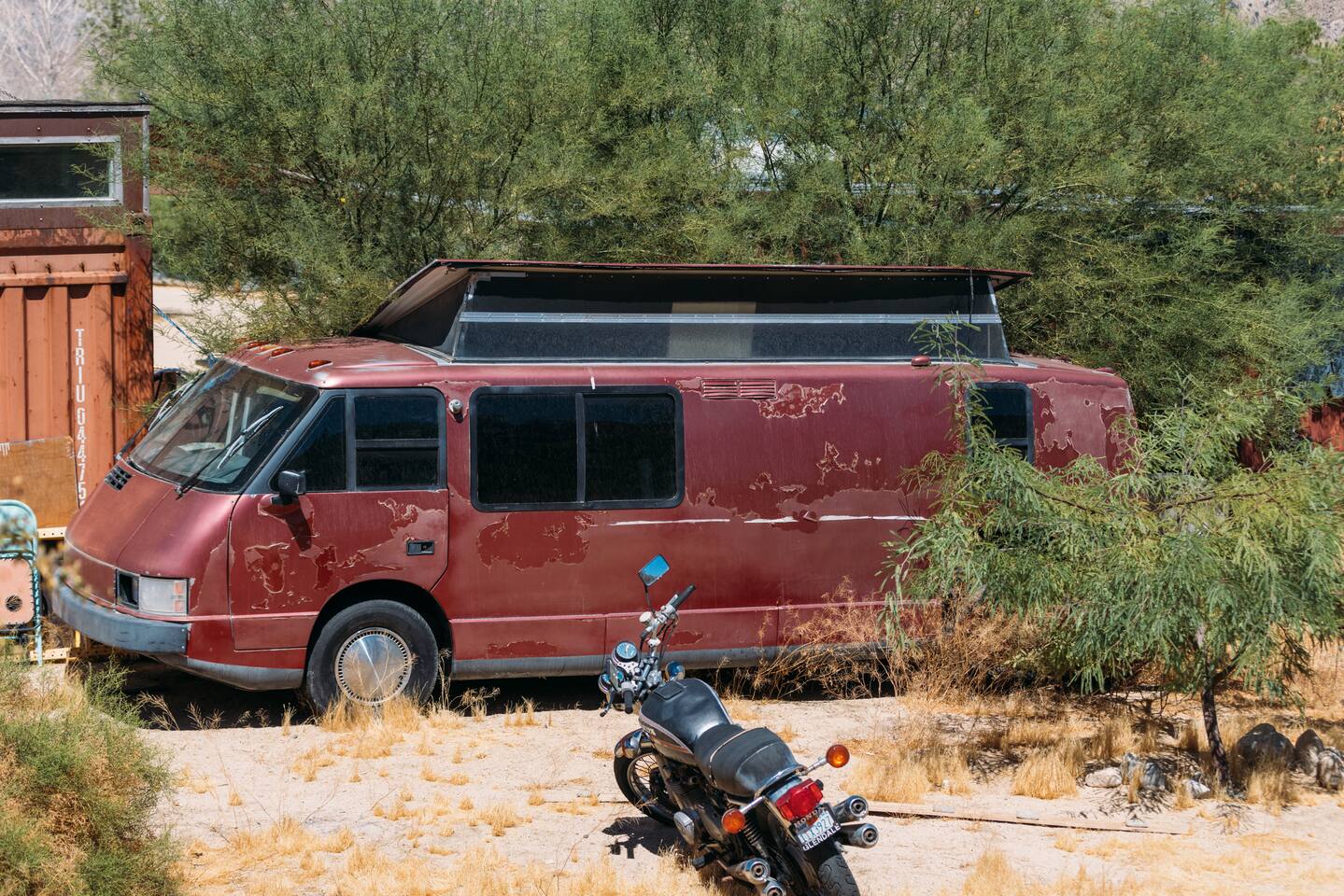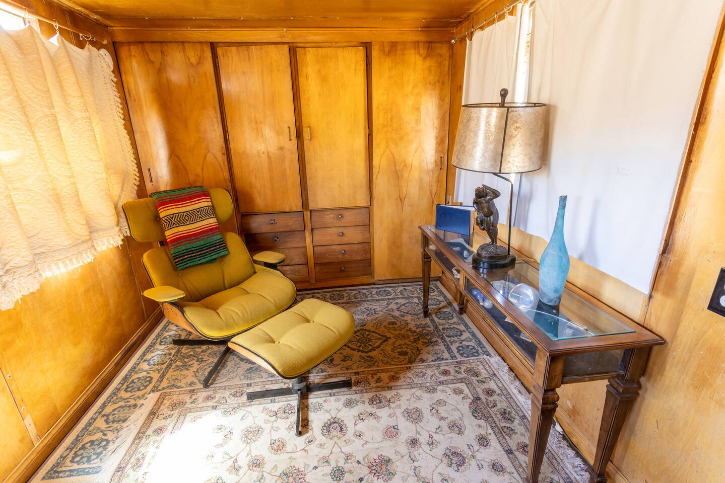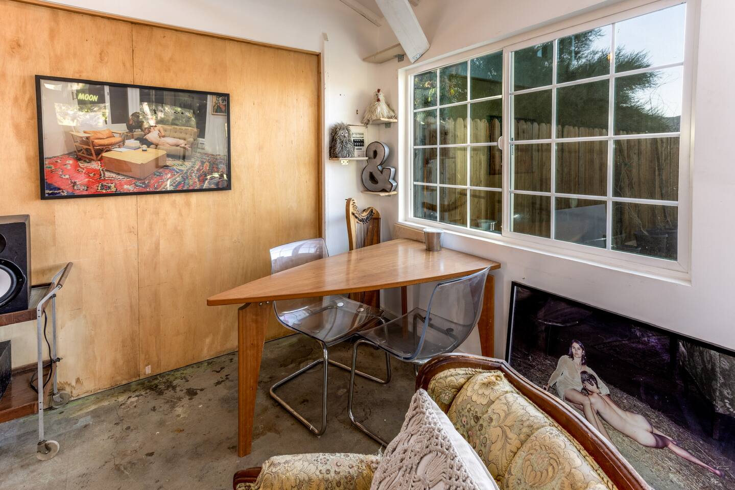 High Desert Protocol — A Secluded Creative Compound for Groups, Gatherings & Getaways Welcome to High Desert Protocol, a 6-acre sanctuary tucked into the hills above Yucca Valley—just a short drive from Pioneertown, Joshua Tree National Park, and the iconic Pappy & Harriet’s. Designed for creative communion, private restoration, and unforgettable gatherings, the compound features three distinct homes, three beautifully restored vintage trailers, a converted shipping container art gallery/bedroom, and a converted boat.The Compound can comfortably sleep up to 19 guests (and more with advance notice). We just completed the newest addition to our property - the Quonset Hut. Designed as a large multipurpose event space, the Quonset Hut can host dinner parties, events, parties, screenings, performances, and more. The Quonset Hut adds an additional bathroom to the property with a massive two-headed concrete shower. Designed by a musician, the Quonset Hut is fully equipped as a recording studio. Musicians please inquire about using the recording facilities. Photos of the Quonset Hut coming soon. ✹ What You’ll Find Across the Property: - Three King Beds, plus additional single and full beds - Three Full Kitchens, including a fully-stocked outdoor kitchen with grill, griddle, and smoker - 80-foot Above-Ground Concrete Pool & Hot Tub (clothing optional) - Shaded Cabana Lounge with sun loungers - 9-Foot Grand Piano in the main house - Fire Pit (BYO wood, wind + weather permitting) - Hundreds of Acres of Pristine Public Land at your doorstep—ideal for hiking and stargazing THE SPACES ✹ The Main House (The Robin’s Egg) Master bedroom with king bed, soaking tub, and chef’s kitchen Guest room with two single beds and separate bathroom Large living room with 80-inch flatscreen TV and grand piano Indoor/outdoor dining areas Recently painted a vibrant, inviting green (updated photos coming soon!) ✹ Vintage Canned Ham Trailer Located beside the main house Sleeps 1 in a twin bed Warm and nostalgic, equipped with space heater ✹ The Boat Behind the house One of the most popular sleep spots on the compound Outfitted with full bed + A/C (sleeps two) ✹ The Library Standalone structure with a king bed, massive soaking tub, private kitchen, custom concrete shower Immaculate interior design, perfect for lovers, thinkers, and solitude-seekers ✹ 1955 Spartan Trailer Features a full bed, private bathroom, and kitchenette ✹ Silverstreak Trailer Cozy full bed and desert views ✹ Converted Shipping Container Now a climate-controlled gallery/bedroom, complete with swamp cooler for A/C ✹ Vixen Vintage trailer. ✹ The Pool The compound’s 80-foot pool and jacuzzi are ideal for laps, sunbathing, or quiet sunset soaks. The energy is relaxed and clothing optional. Most guests go nude in the hot tub—it’s kept warm every evening. ✹ The Vibe We’ve built this space with care, over time. It’s a place of freedom, ease, creativity, and connection—with nature and each other. Many of our dearest friends were once Airbnb guests. Others come here and seek complete privacy. We honor both. This is an adults-only property. No one under 18 is permitted. We allow small events and gatherings with prior permission—please reach out if you're planning something special. ✹ A Few Ground Rules: Please rinse off before entering the pool/hot tub (no oils or sunscreen) Be respectful, kind, and aware—of others and the land Fire pit use is permitted only when there’s no wind and weather is safe. Bring your own wood. We’re here if you have questions. Be sure to read the reviews—and we truly hope to welcome you to High Desert Protocol.