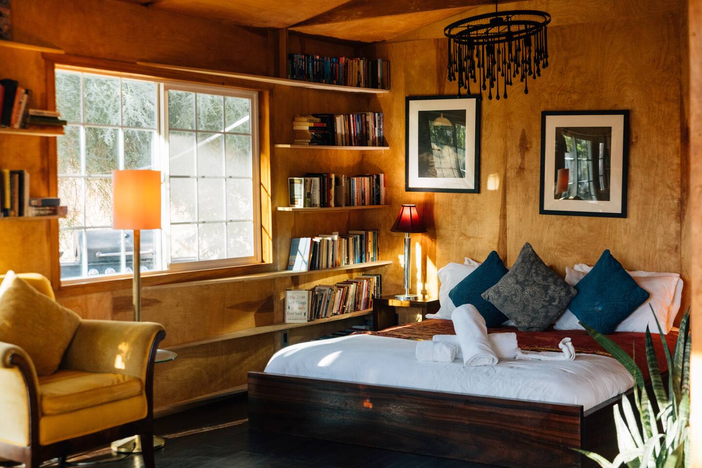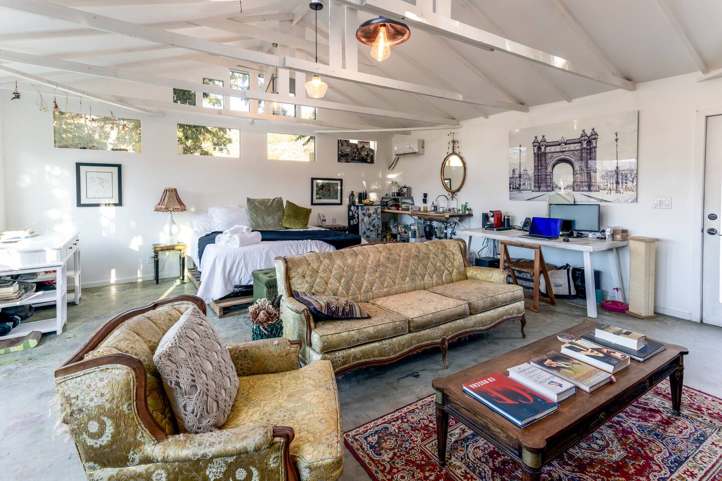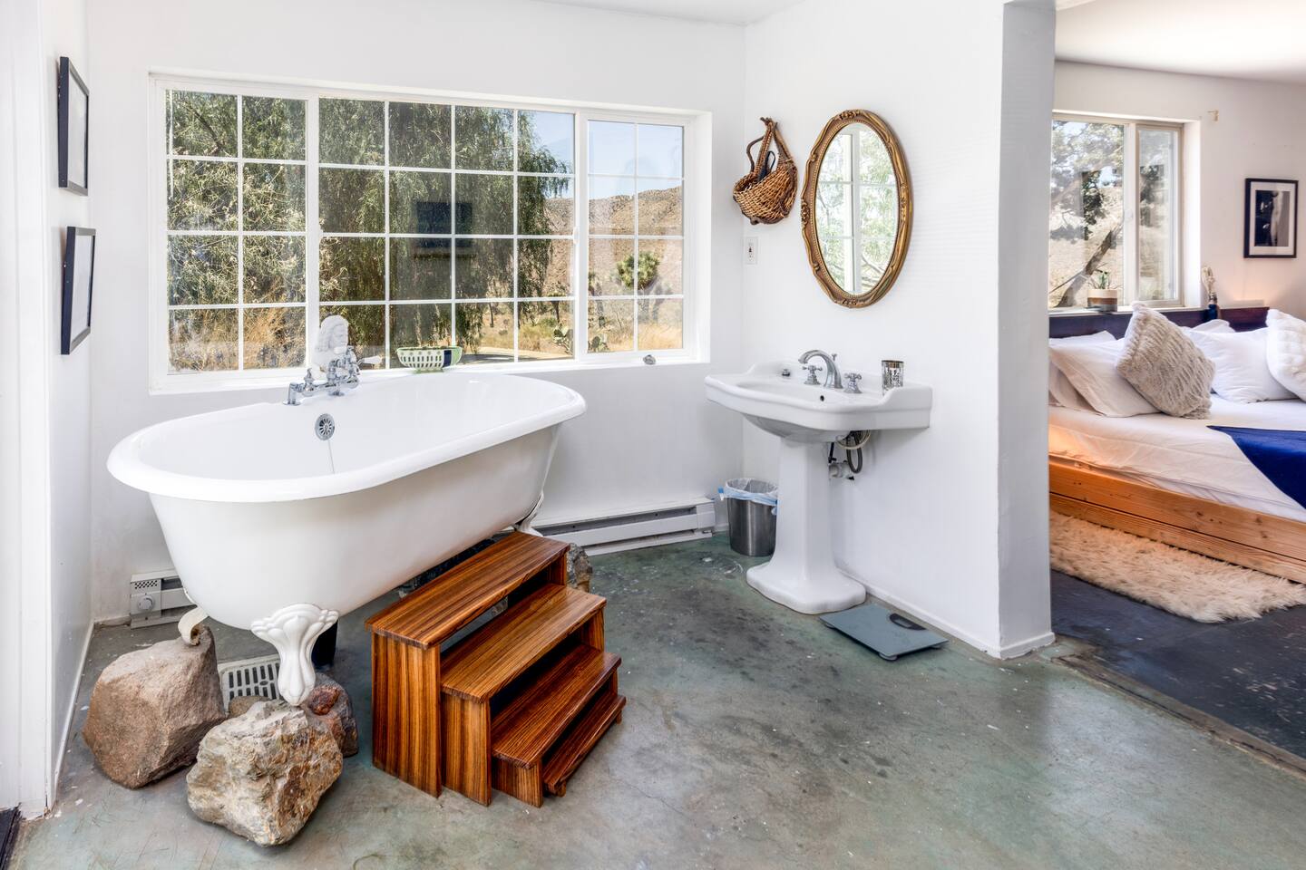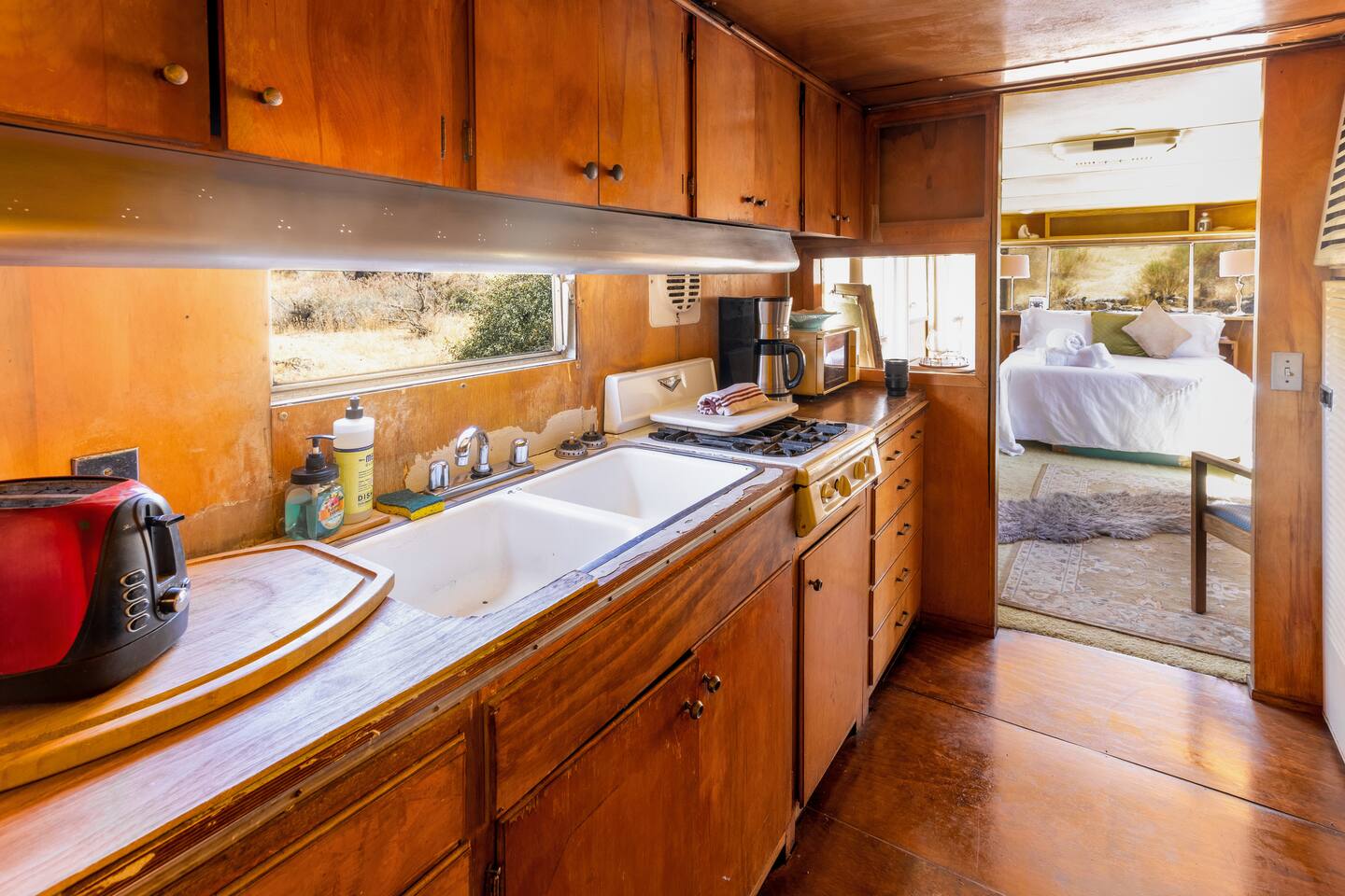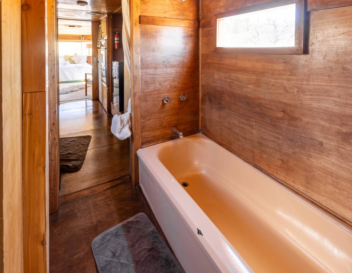 High Desert Protocol — A Secluded Creative Compound for Groups, Gatherings & Getaways Welcome to High Desert Protocol, a 6-acre sanctuary tucked into the hills above Yucca Valley—just a short drive from Pioneertown, Joshua Tree National Park, and the iconic Pappy & Harriet’s. Designed for creative communion, private restoration, and unforgettable gatherings, the compound features three distinct homes, three beautifully restored vintage trailers, a converted shipping container art gallery/bedroom, and a converted boat.The Compound can comfortably sleep up to 19 guests (and more with advance notice). We just completed the newest addition to our property - the Quonset Hut. Designed as a large multipurpose event space, the Quonset Hut can host dinner parties, events, parties, screenings, performances, and more. The Quonset Hut adds an additional bathroom to the property with a massive two-headed concrete shower. Designed by a musician, the Quonset Hut is fully equipped as a recording studio. Musicians please inquire about using the recording facilities. Photos of the Quonset Hut coming soon. ✹ What You’ll Find Across the Property: - Three King Beds, plus additional single and full beds - Three Full Kitchens, including a fully-stocked outdoor kitchen with grill, griddle, and smoker - 80-foot Above-Ground Concrete Pool & Hot Tub (clothing optional) - Shaded Cabana Lounge with sun loungers - 9-Foot Grand Piano in the main house - Fire Pit (BYO wood, wind + weather permitting) - Hundreds of Acres of Pristine Public Land at your doorstep—ideal for hiking and stargazing THE SPACES ✹ The Main House (The Robin’s Egg) Master bedroom with king bed, soaking tub, and chef’s kitchen Guest room with two single beds and separate bathroom Large living room with 80-inch flatscreen TV and grand piano Indoor/outdoor dining areas Recently painted a vibrant, inviting green (updated photos coming soon!) ✹ Vintage Canned Ham Trailer Located beside the main house Sleeps 1 in a twin bed Warm and nostalgic, equipped with space heater ✹ The Boat Behind the house One of the most popular sleep spots on the compound Outfitted with full bed + A/C (sleeps two) ✹ The Library Standalone structure with a king bed, massive soaking tub, private kitchen, custom concrete shower Immaculate interior design, perfect for lovers, thinkers, and solitude-seekers ✹ 1955 Spartan Trailer Features a full bed, private bathroom, and kitchenette ✹ Silverstreak Trailer Cozy full bed and desert views ✹ Converted Shipping Container Now a climate-controlled gallery/bedroom, complete with swamp cooler for A/C ✹ Vixen Vintage trailer. ✹ The Pool The compound’s 80-foot pool and jacuzzi are ideal for laps, sunbathing, or quiet sunset soaks. The energy is relaxed and clothing optional. Most guests go nude in the hot tub—it’s kept warm every evening. ✹ The Vibe We’ve built this space with care, over time. It’s a place of freedom, ease, creativity, and connection—with nature and each other. Many of our dearest friends were once Airbnb guests. Others come here and seek complete privacy. We honor both. This is an adults-only property. No one under 18 is permitted. We allow small events and gatherings with prior permission—please reach out if you're planning something special. ✹ A Few Ground Rules: Please rinse off before entering the pool/hot tub (no oils or sunscreen) Be respectful, kind, and aware—of others and the land Fire pit use is permitted only when there’s no wind and weather is safe. Bring your own wood. We’re here if you have questions. Be sure to read the reviews—and we truly hope to welcome you to High Desert Protocol.