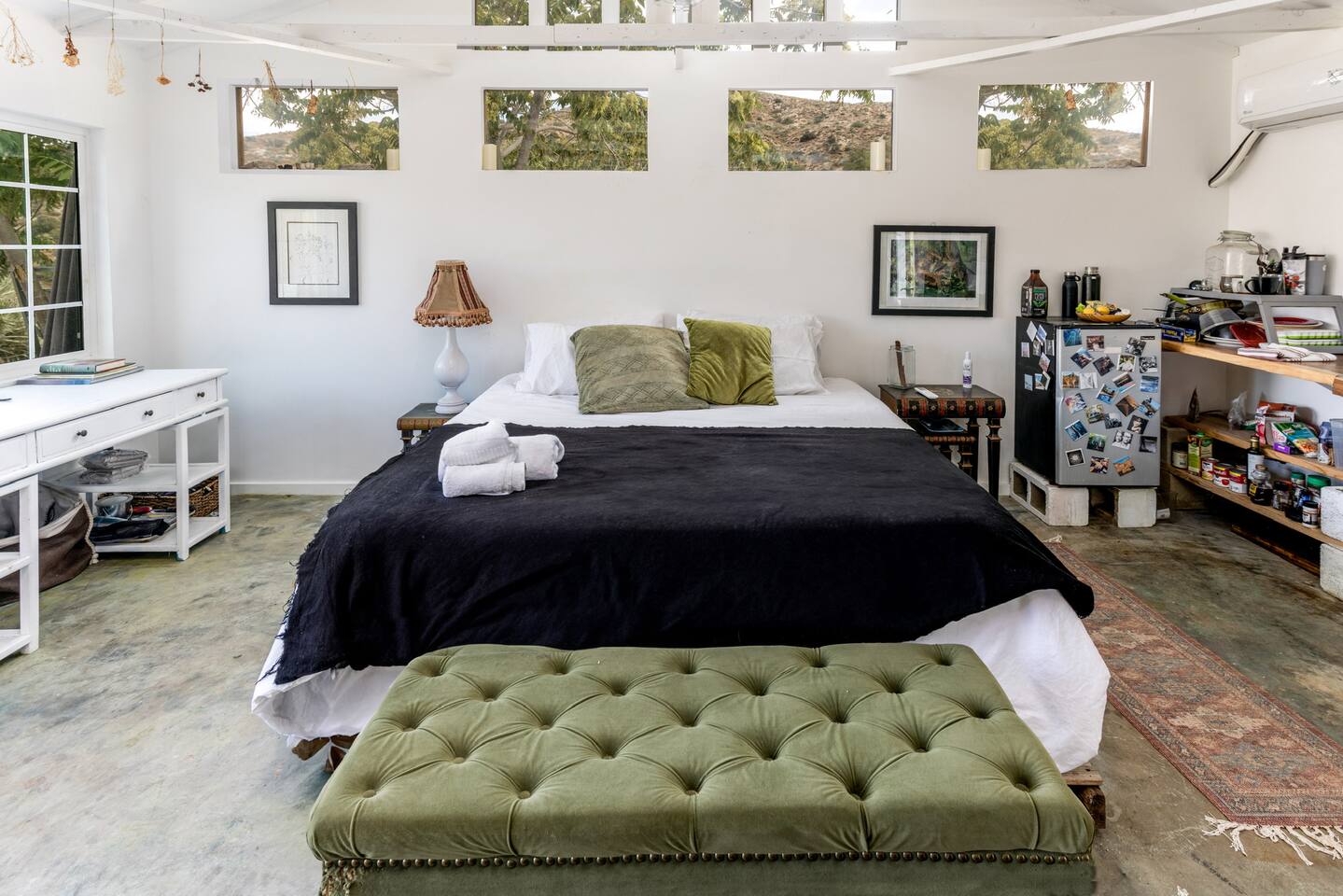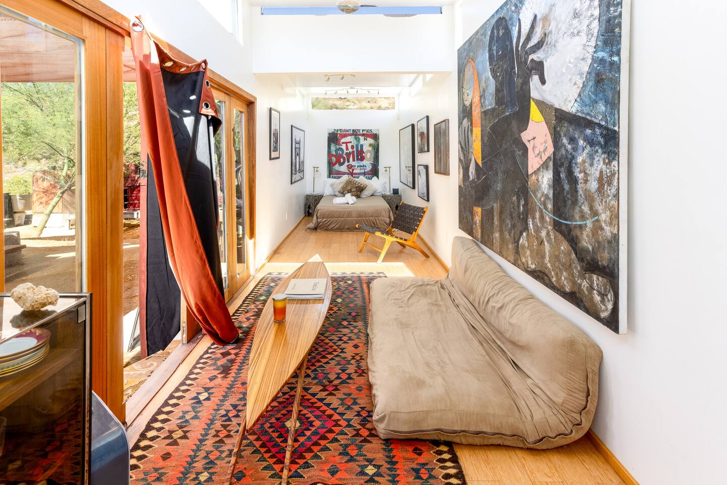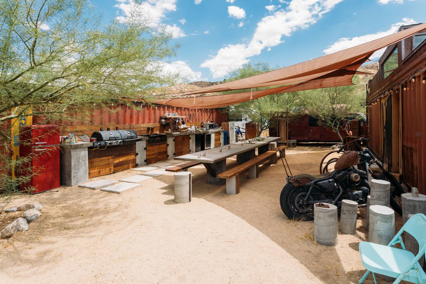 With a full compound rental, guests have access to every amenity: three houses, three kitchens (one fully stocked outdoor kitchen), four renovated trailers, one art gallery/bedroom, one converted boat, large outdoor dining area, 80-foot swimming pool, hot tub, and the recently launched Quonset Hut.