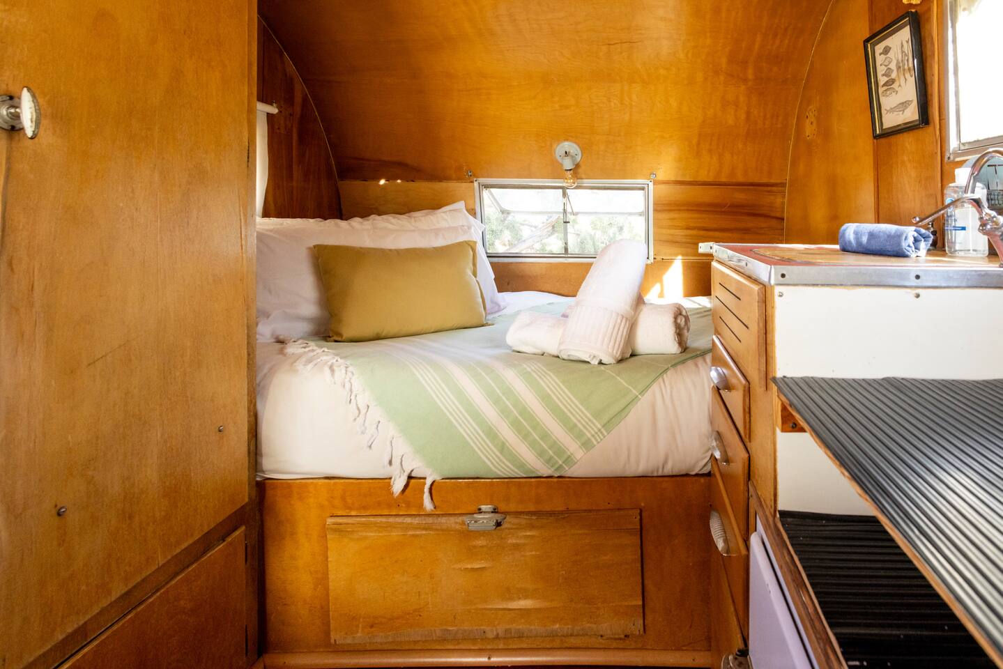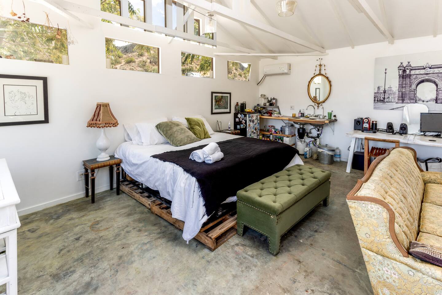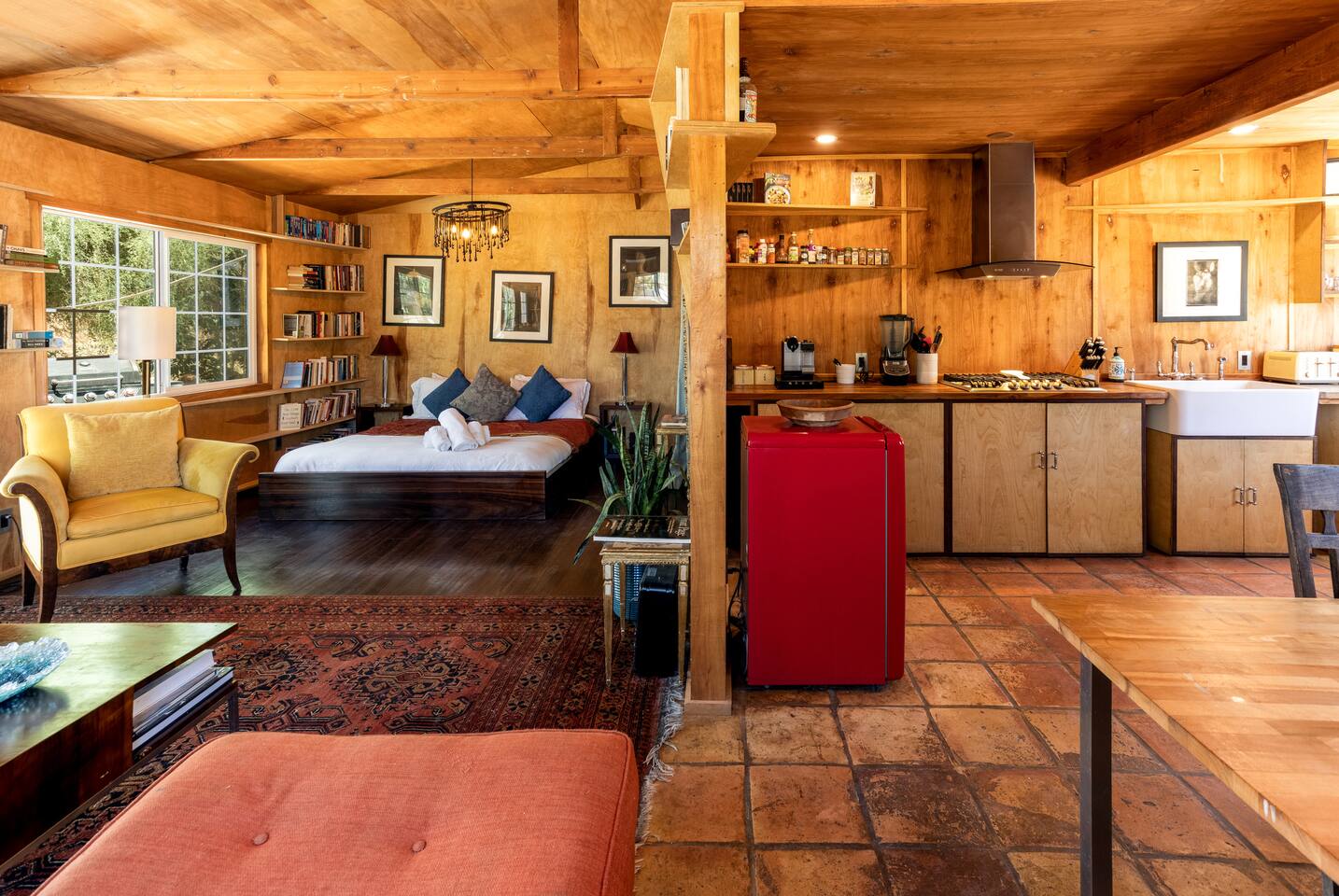 With a full compound rental, guests have access to every amenity: three houses, three kitchens (one fully stocked outdoor kitchen), four renovated trailers, one art gallery/bedroom, one converted boat, large outdoor dining area, 80-foot swimming pool, hot tub, and the recently launched Quonset Hut.