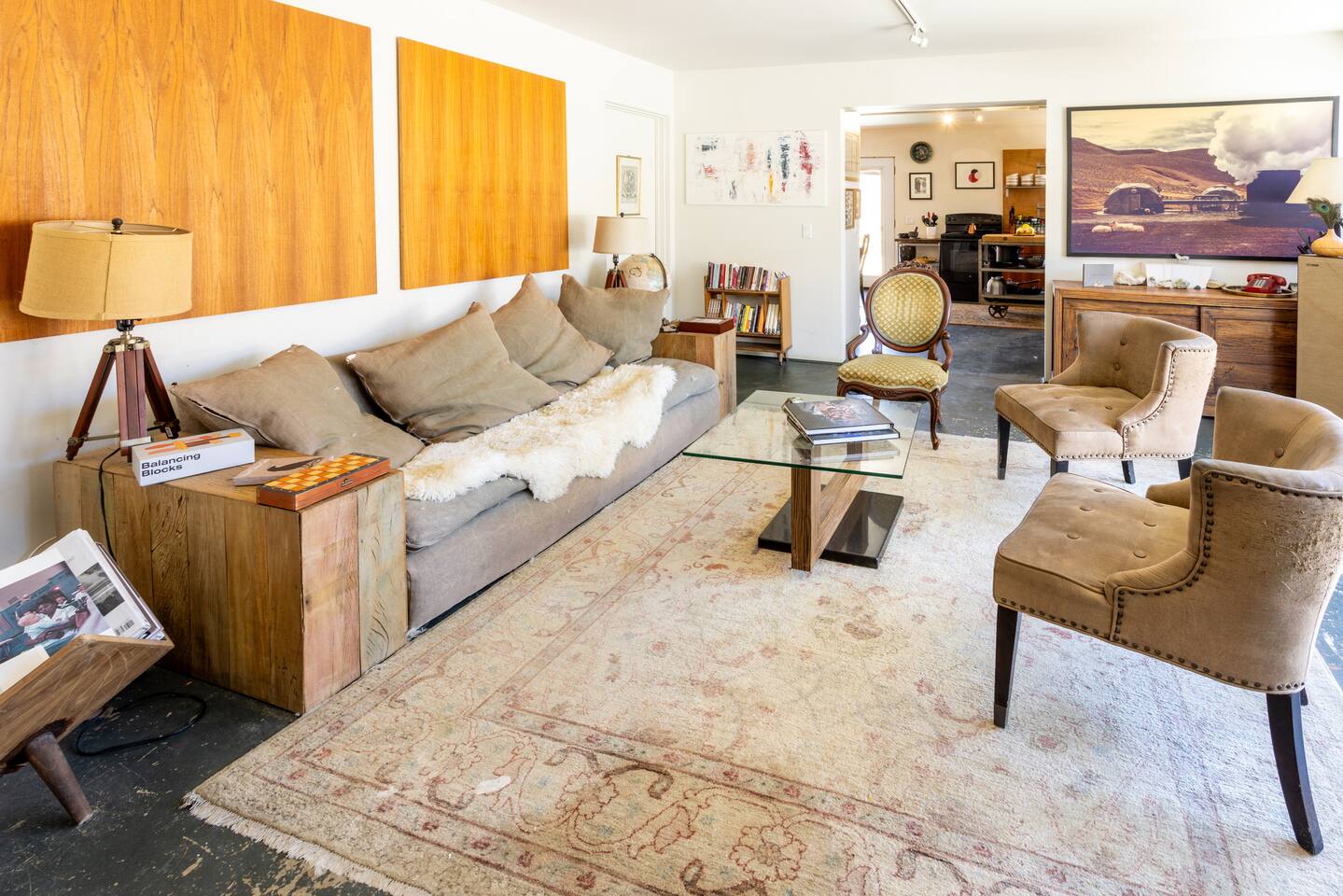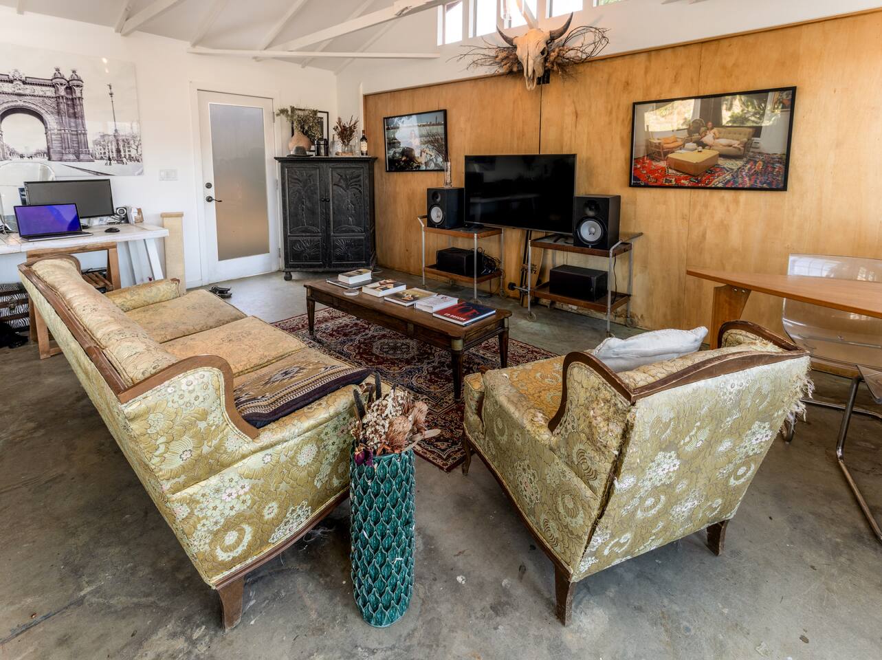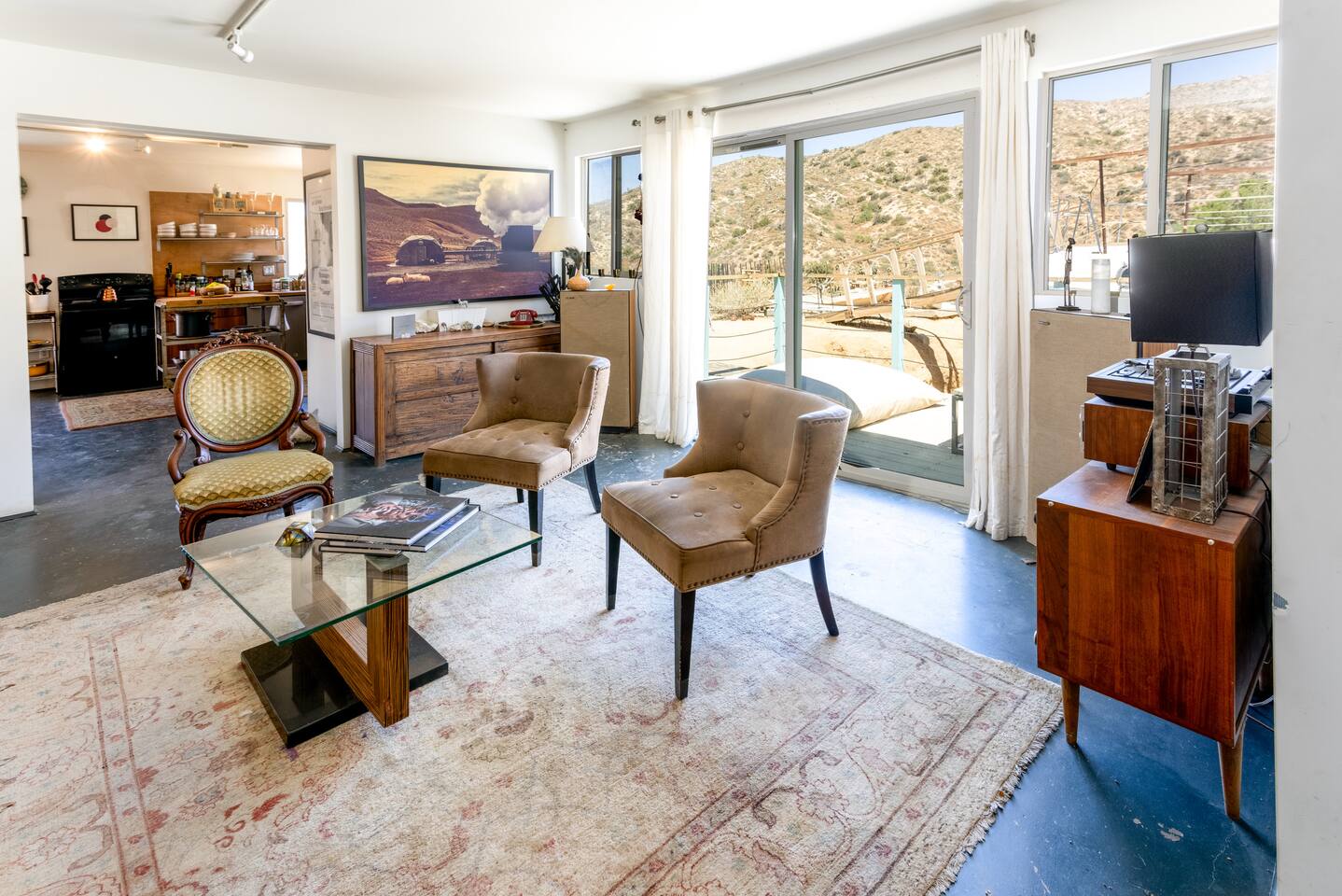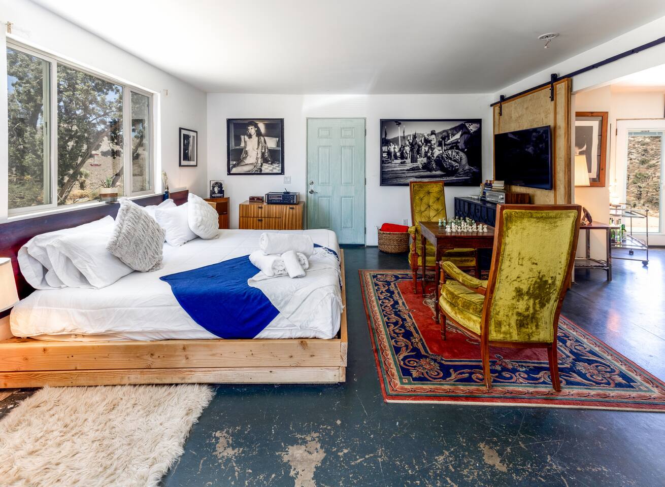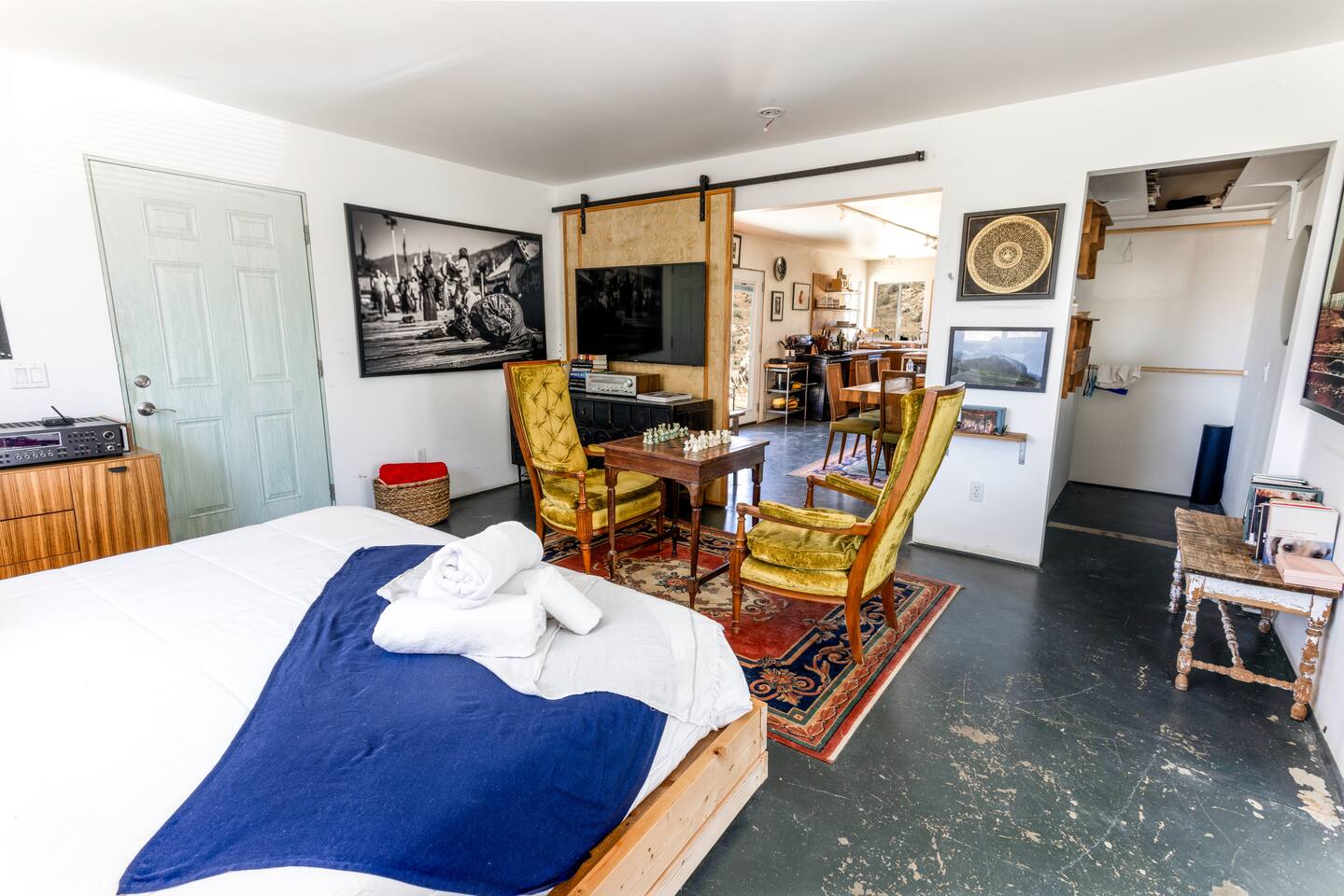 Welcome to High Desert Protocol, offered for the first time in its entirety. The Compound is HDP's flagship property that sleeps 16+ guests. Located next to public land, it spans 6 acres, 3 homes, 4 vintage renovated trailers, an art gallery/bedroom, and a converted boat. Our recent addition is the Quonset Hut - a large multipurpose event space (photos coming soon). With an 80 foot pool, hot tub, and 3 kitchens, this is the perfect place for weddings, gatherings, retreats and dinner parties.