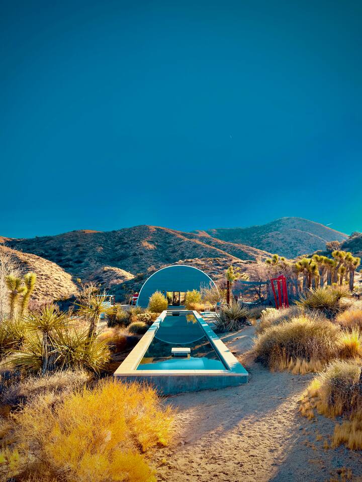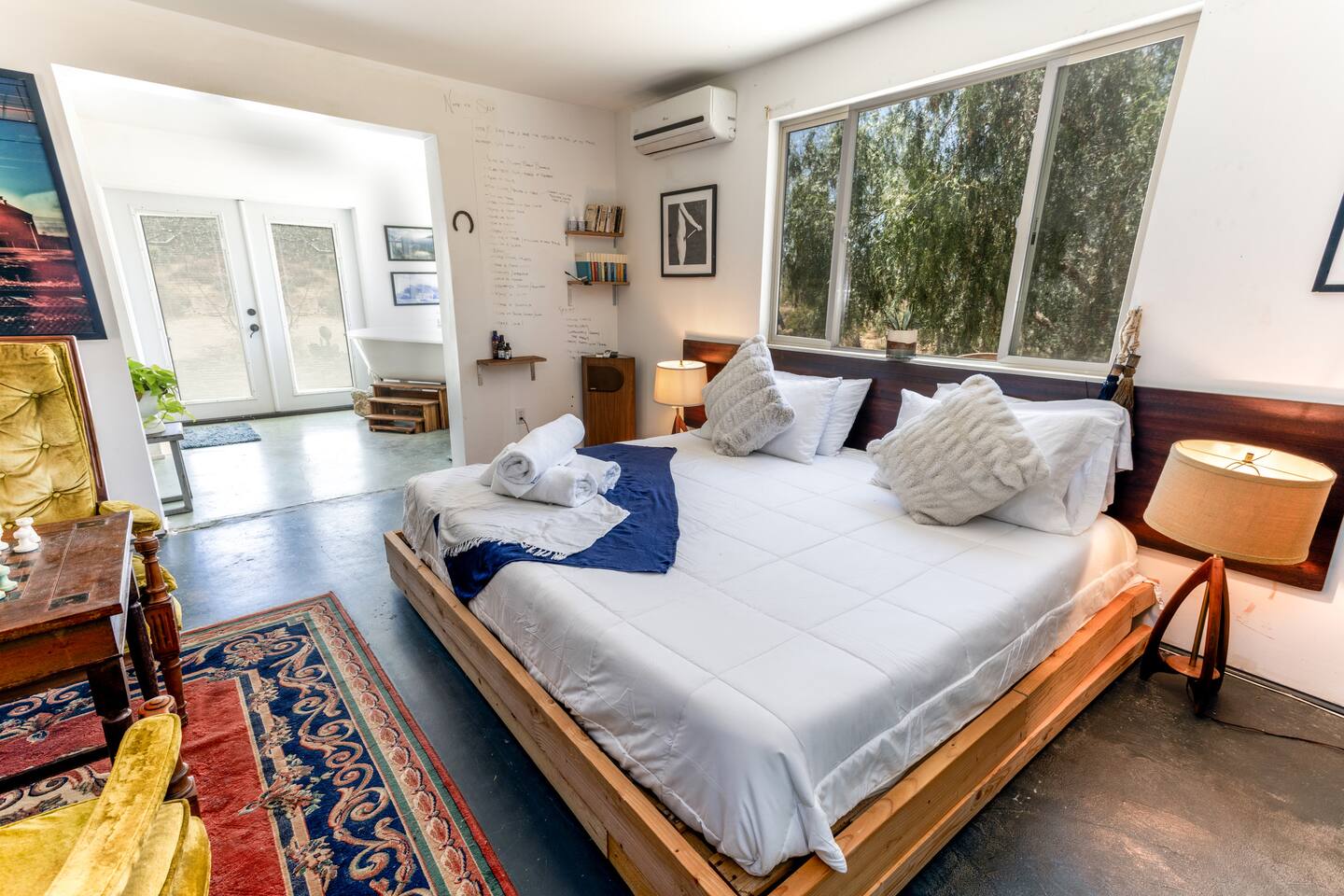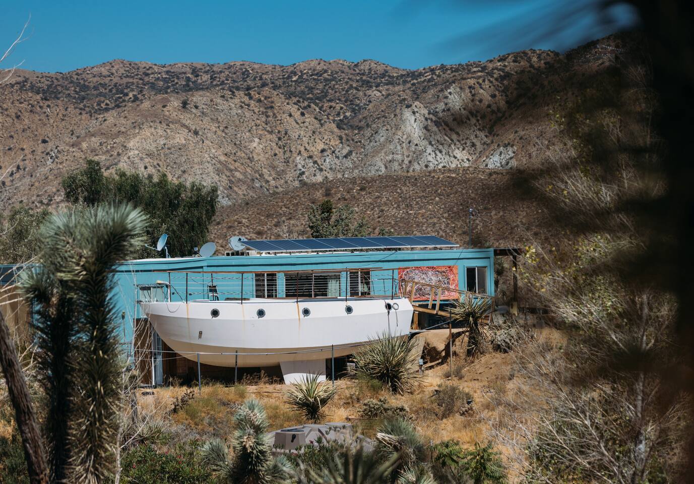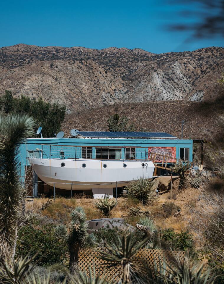 A serene, design-forward desert retreat located on a secluded 6-acre artist compound in Joshua Tree. The Robin's Egg features two bedrooms and two additional unique sleep spaces - a boat and a vintage trailer. The Robin's Egg boasts a 9-foot grand piano, 80-inch flatscreen TV, chef's kitchen, indoor/outdoor dining areas, and a large soaking tub. Guests have access to a shared 80-foot pool, hot tub (clothing optional), and large outdoor kitchen. There are hiking trails off of the property.