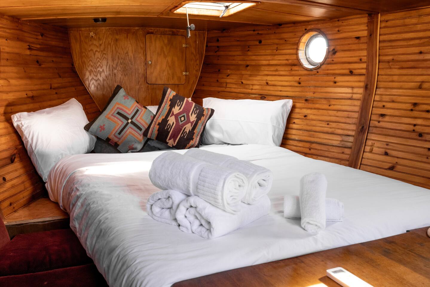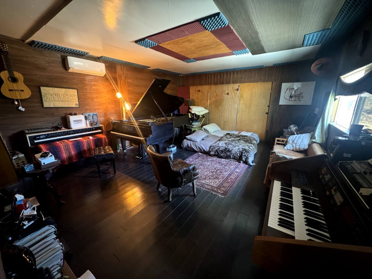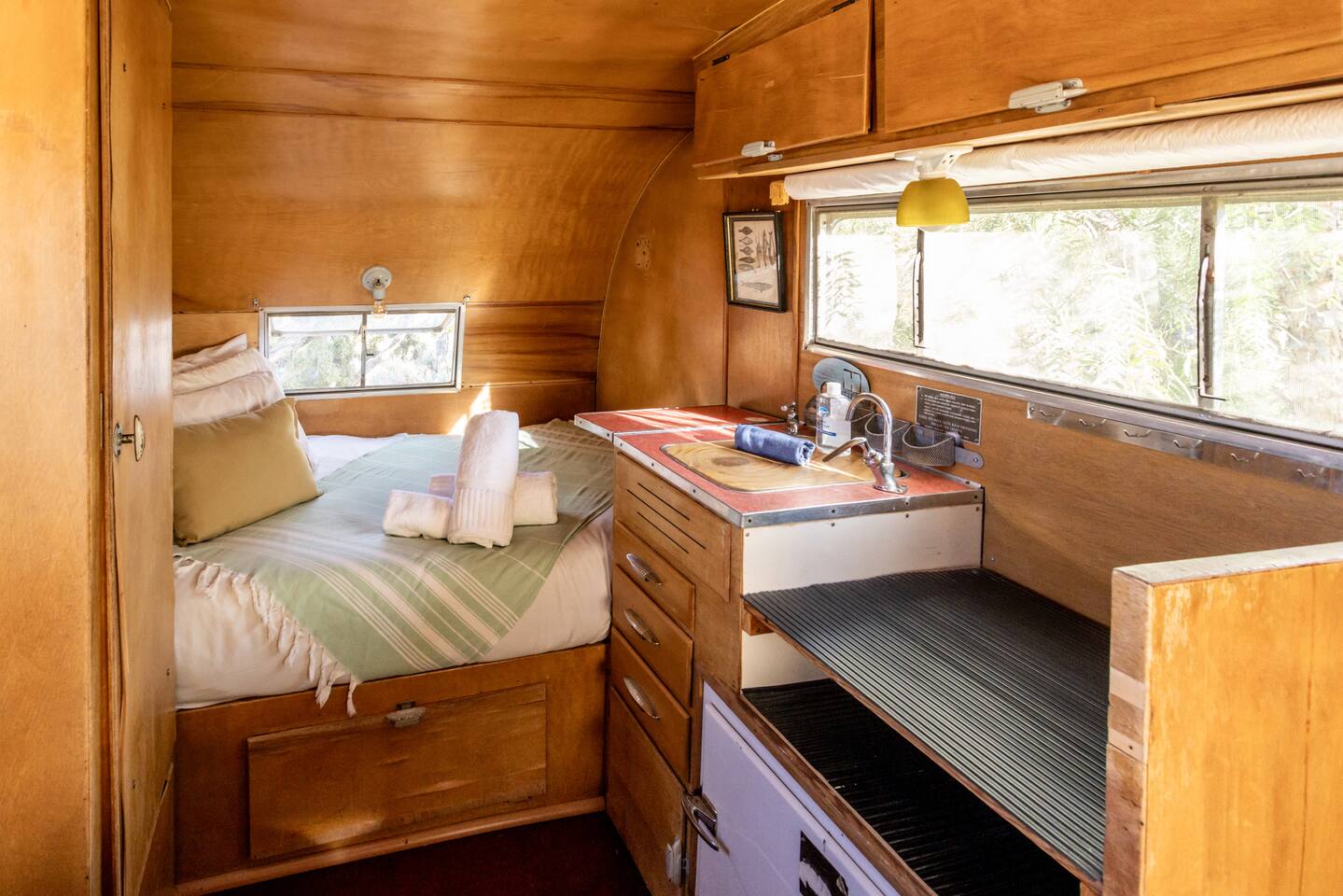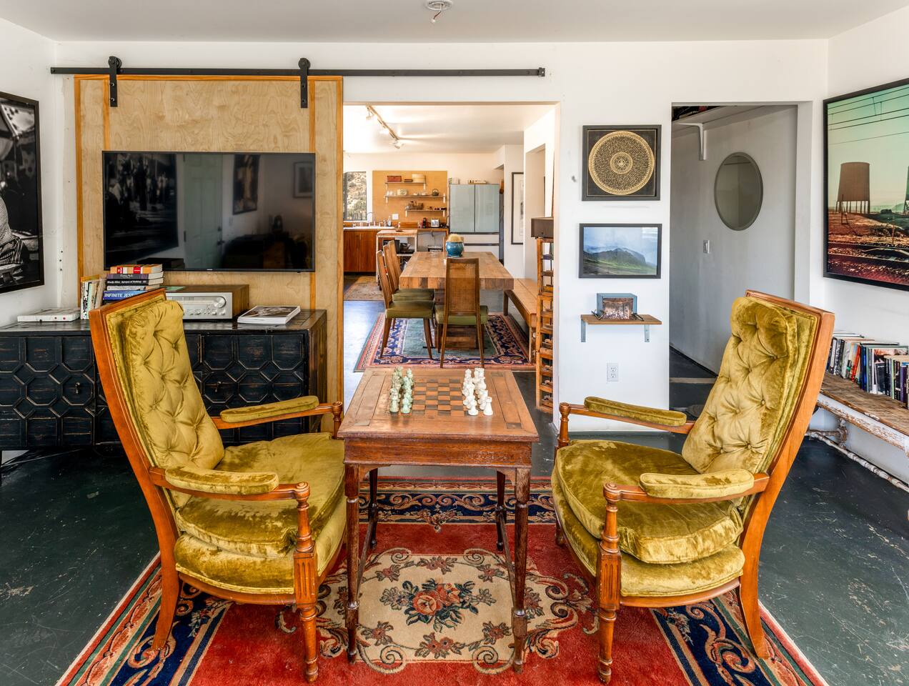 A serene, design-forward desert retreat located on a secluded 6-acre artist compound in Joshua Tree. The Robin's Egg features two bedrooms and two additional unique sleep spaces - a boat and a vintage trailer. The Robin's Egg boasts a 9-foot grand piano, 80-inch flatscreen TV, chef's kitchen, indoor/outdoor dining areas, and a large soaking tub. Guests have access to a shared 80-foot pool, hot tub (clothing optional), and large outdoor kitchen. There are hiking trails off of the property.