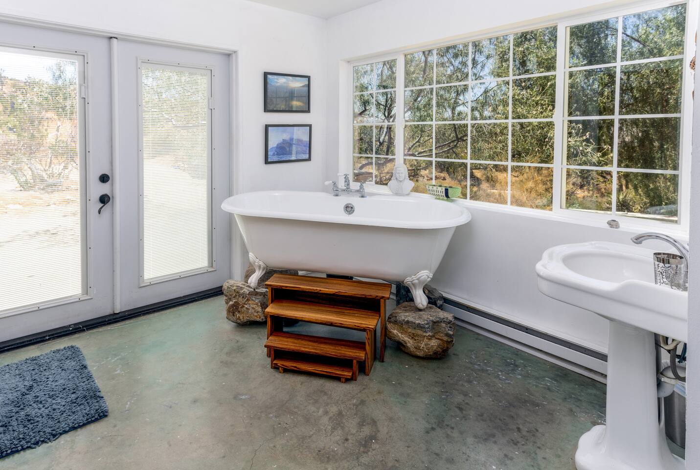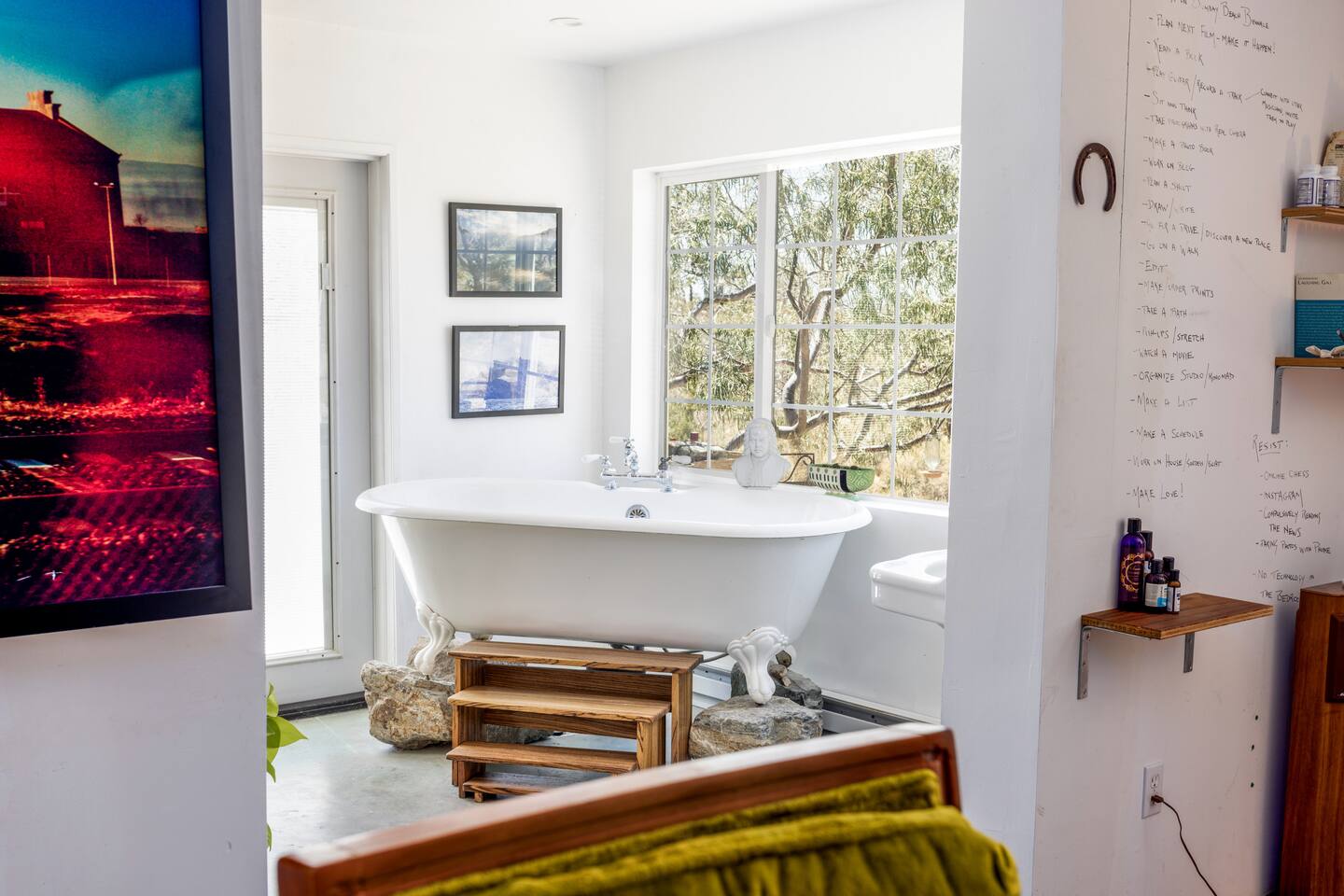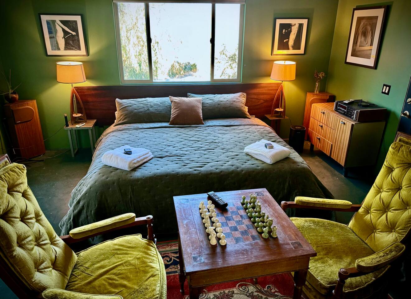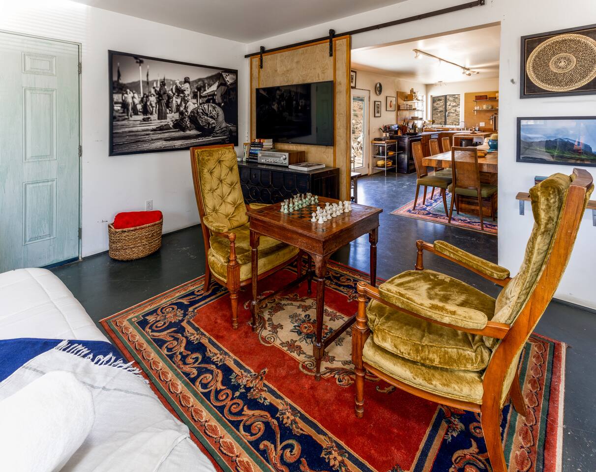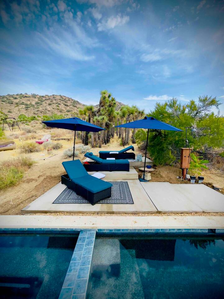 The Robin's Egg is the perfect getaway for couples, groups, or solo travelers. The house features one master bedroom with king bed and large soaking tub, and one additional guest bedroom and bathroom. Adjacent to the house is a vintage Canned Ham trailer that sleeps two. Behind the house is a boat equipped with a bed and A/C - this is one of the most popular sleep spots on the compound. The Robin's Egg is tucked away from the rest of the compound - offers true solitude when you want it, and easy connection when you don’t. Wander down to the shared pool, jacuzzi, and outdoor kitchen, or disappear into the hills behind the property, where hundreds of acres of pristine government land stretch endlessly—just as wild and breathtaking as anything in the national park. *PLEASE NOTE THAT SINCE THESE PHOTOS HAVE BEEN TAKEN THE INTERIOR OF THE HOUSE HAS BEEN PAINTED GREEN. And we added an 80-inch flatscreen TV to the living room.* Inside, you’ll find a chef's kitchen, 9 foot grand piano, 80-inch flatscreen TV, and a large dining area. Please note: this is an adults-only property. No one under 18 is permitted. The Pool The pool and jacuzzi span 80 feet—ideal for swimming laps, sunbathing, or soaking in stillness. The vibe is relaxed, clothing-optional, and deeply respectful. Most guests go nude in the hot tub, which is kept warm and ready each evening around sunset. We aim to foster a space of freedom, ease, and creative communion—with nature and one another. There are few rules here, but a few gentle reminders: Please rinse off before entering the pool or hot tub—no oils, sunscreen, or dirt. Be respectful, kind, and calm. This is a liberal, open environment, but we deeply value thoughtfulness. Some of our closest friends were once Airbnb guests. Others come here for complete solitude. We honor both paths—please do the same. If you have questions, reach out anytime. Be sure to read the reviews. I hope to welcome you soon. PS: There is a fire pit. You’re welcome to use it—only if there’s no wind and the weather isn’t too hot or dry. Bring your own wood and please use caution.
