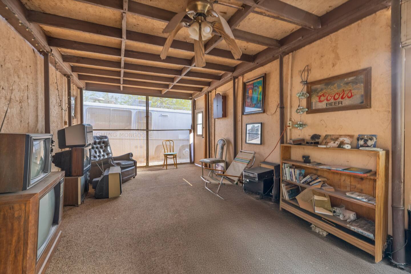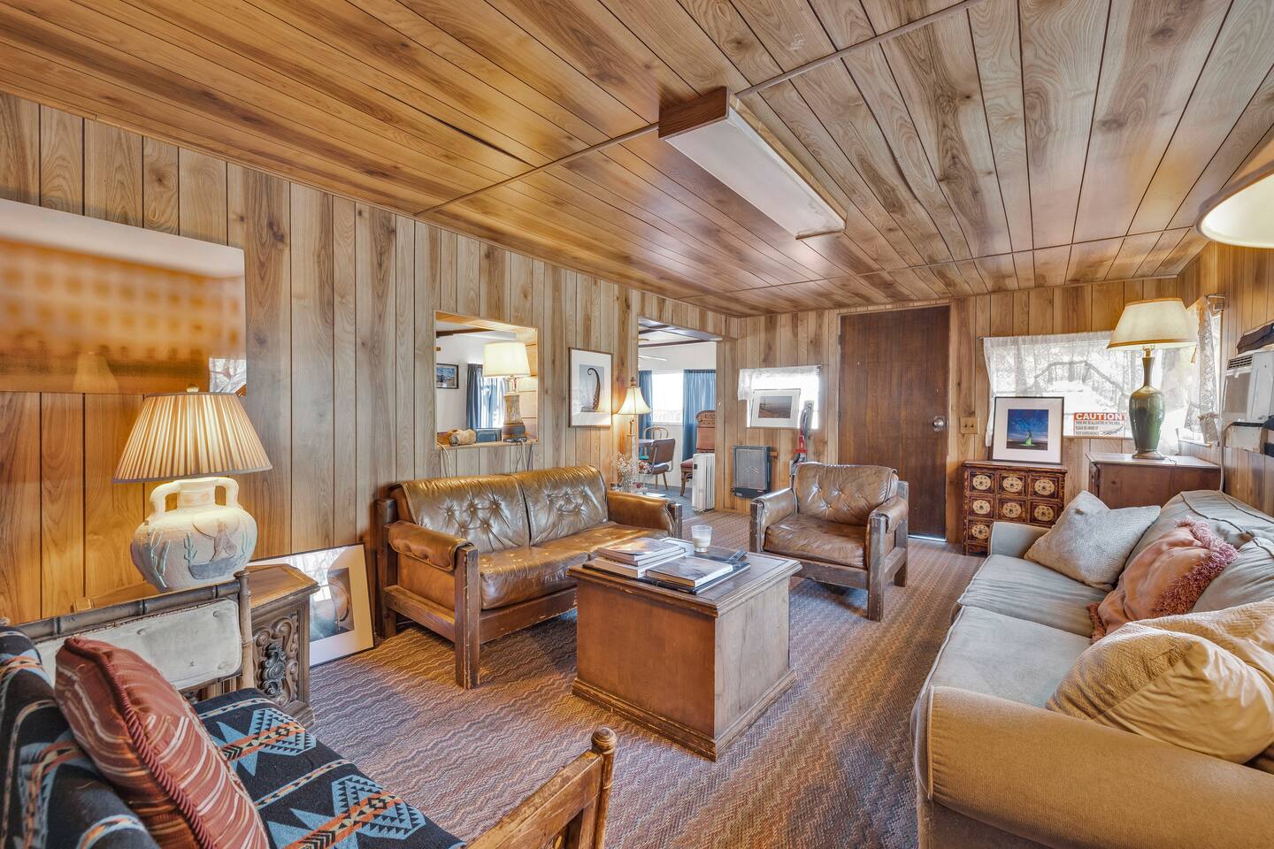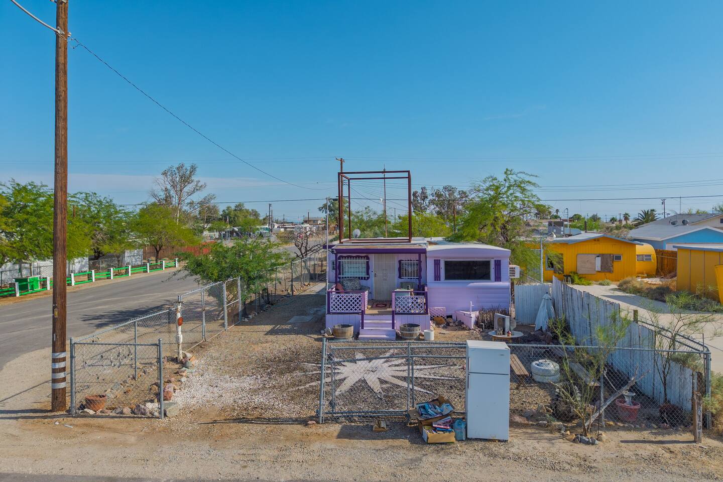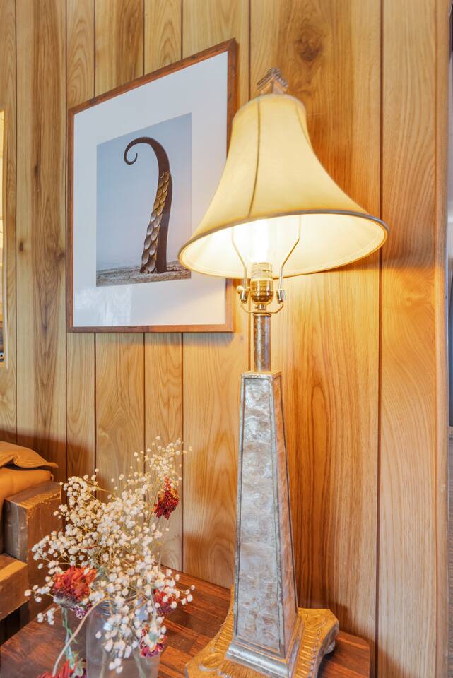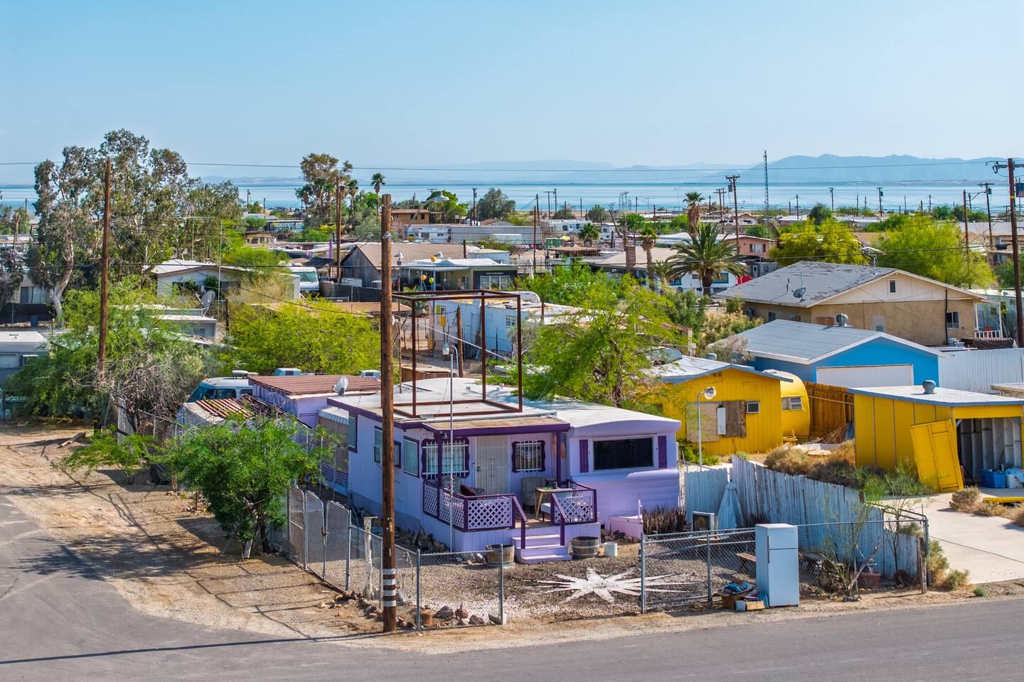 A kitsch-soaked hideaway in the post-apocalyptic wonderland of Bombay Beach: step inside The Palazzo, where roadside Americana meets desert surrealism. This one-bedroom retreat is drenched in charm and eccentricity: think leather club chairs, vintage lamps, wood paneling, and bold prints by the photographer-owner. The atmosphere is equal parts lodge, love letter, and Lynchian living room. Located at 1st Street and Avenue E—just five blocks from the ghostly shores of the Salton Sea—this fully air-conditioned home is your launchpad for exploring the strange sublime of the Imperial Valley: Salvation Mountain, Slab City, East Jesus, and the decaying glamour of Bombay Beach itself. Inside: • A queen bedroom with crisp linens and dreamcatchers above the bed • A spacious living room with two sofas, armchairs, a flatscreen TV, and glowing lamps for that golden-hour glow all night long • A dining nook that conjures 1970s supper club vibes • A stocked kitchen and a cozy office nook with an ergonomic chair for remote work or poetic musing • Lighting-fast WiFi, three cooling units, and a porch facing the train tracks for your daily fix of cinematic ambience The lot is fenced, pet-friendly, and private. But remember: Bombay Beach is more than a destination—it’s an art colony, social experiment, and poetic ruin. There’s no gas station. But there is magic.