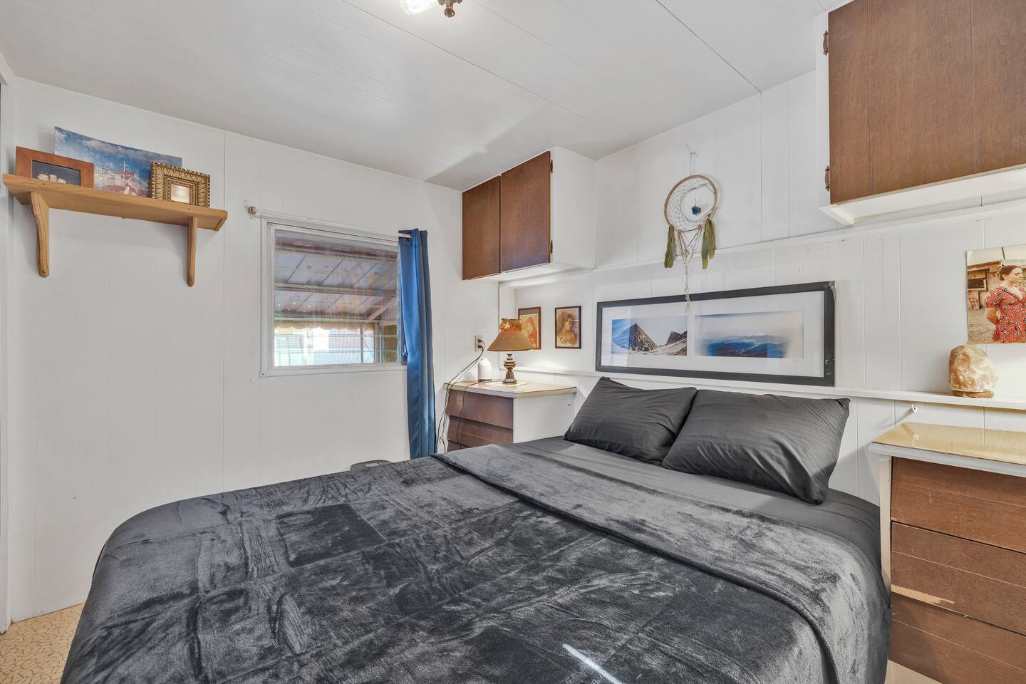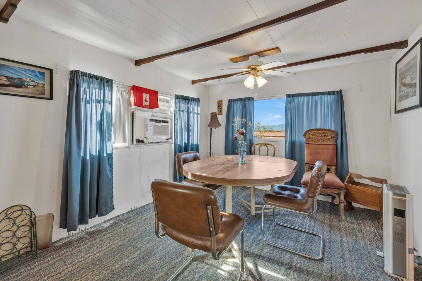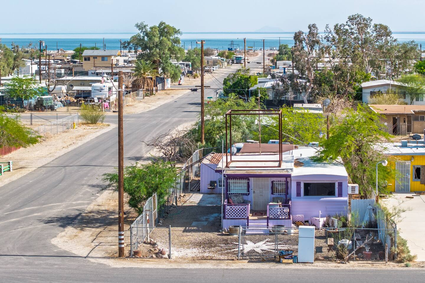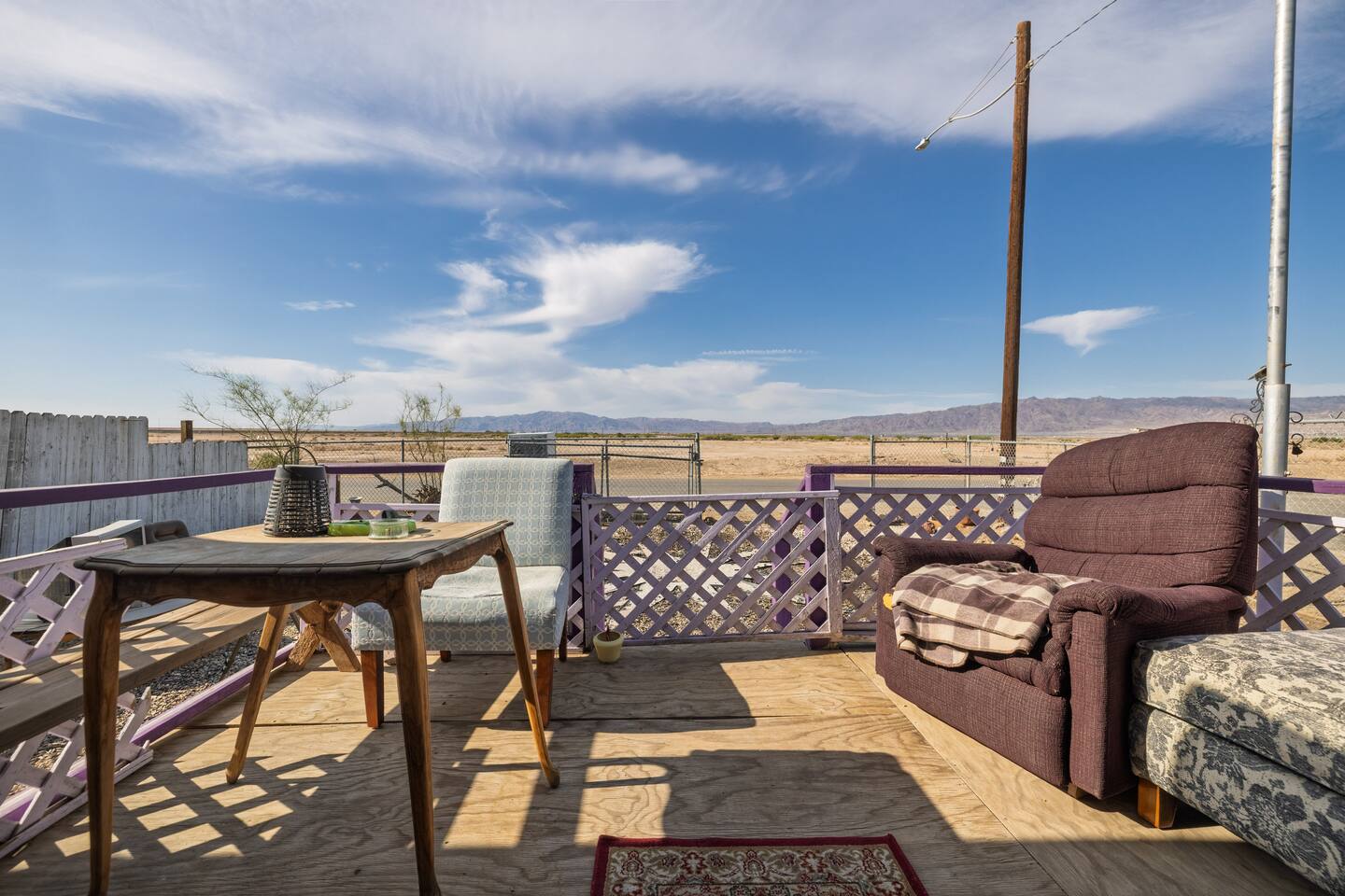 A kitsch-soaked hideaway in the post-apocalyptic wonderland of Bombay Beach: step inside The Palazzo, where roadside Americana meets desert surrealism. This one-bedroom retreat is drenched in charm and eccentricity: think leather club chairs, vintage lamps, wood paneling, and bold prints by the photographer-owner. The atmosphere is equal parts lodge, love letter, and Lynchian living room. Located at 1st Street and Avenue E—just five blocks from the ghostly shores of the Salton Sea—this fully air-conditioned home is your launchpad for exploring the strange sublime of the Imperial Valley: Salvation Mountain, Slab City, East Jesus, and the decaying glamour of Bombay Beach itself. Inside: • A queen bedroom with crisp linens and dreamcatchers above the bed • A spacious living room with two sofas, armchairs, a flatscreen TV, and glowing lamps for that golden-hour glow all night long • A dining nook that conjures 1970s supper club vibes • A stocked kitchen and a cozy office nook with an ergonomic chair for remote work or poetic musing • Lighting-fast WiFi, three cooling units, and a porch facing the train tracks for your daily fix of cinematic ambience The lot is fenced, pet-friendly, and private. But remember: Bombay Beach is more than a destination—it’s an art colony, social experiment, and poetic ruin. There’s no gas station. But there is magic.