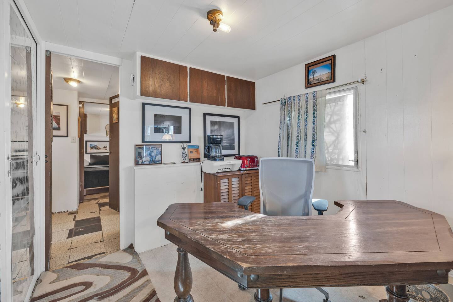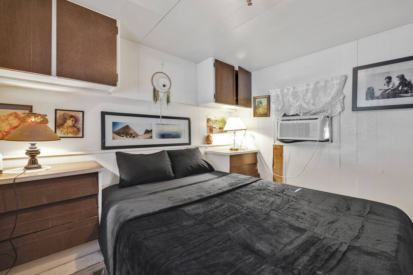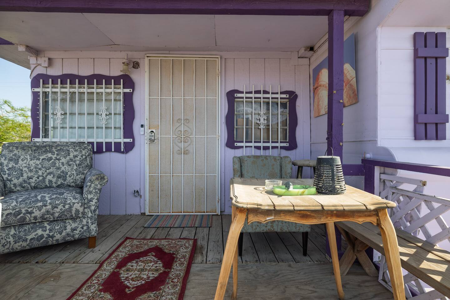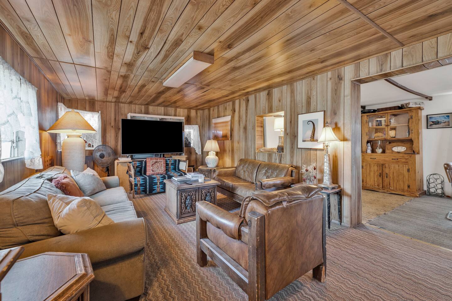 A kitsch-soaked hideaway in the post-apocalyptic wonderland of Bombay Beach: step inside The Palazzo, where roadside Americana meets desert surrealism. This one-bedroom retreat is drenched in charm and eccentricity: think leather club chairs, vintage lamps, wood paneling, and bold prints by the photographer-owner. The atmosphere is equal parts lodge, love letter, and Lynchian living room. Located at 1st Street and Avenue E—just five blocks from the ghostly shores of the Salton Sea—this fully air-conditioned home is your launchpad for exploring the strange sublime of the Imperial Valley: Salvation Mountain, Slab City, East Jesus, and the decaying glamour of Bombay Beach itself. Inside: • A queen bedroom with crisp linens and dreamcatchers above the bed • A spacious living room with two sofas, armchairs, a flatscreen TV, and glowing lamps for that golden-hour glow all night long • A dining nook that conjures 1970s supper club vibes • A stocked kitchen and a cozy office nook with an ergonomic chair for remote work or poetic musing • Lighting-fast WiFi, three cooling units, and a porch facing the train tracks for your daily fix of cinematic ambience The lot is fenced, pet-friendly, and private. But remember: Bombay Beach is more than a destination—it’s an art colony, social experiment, and poetic ruin. There’s no gas station. But there is magic.