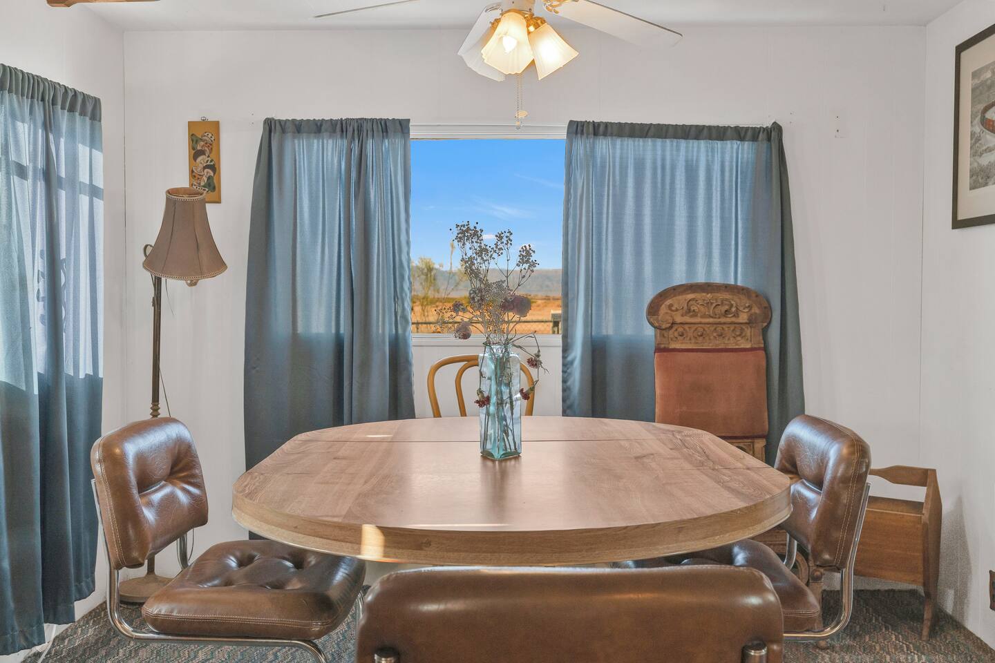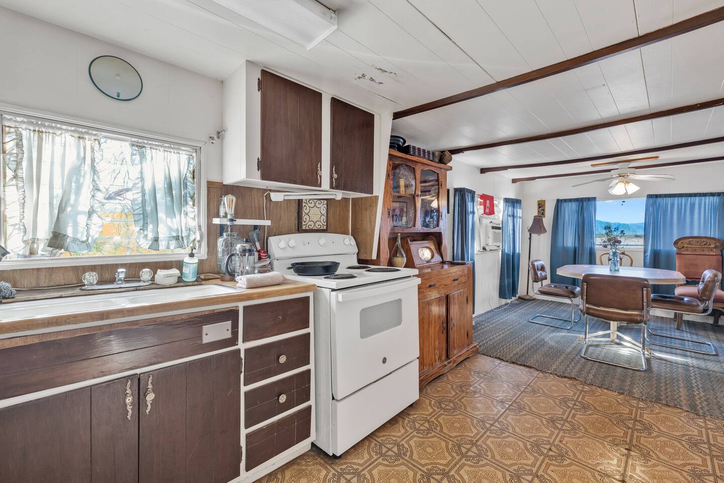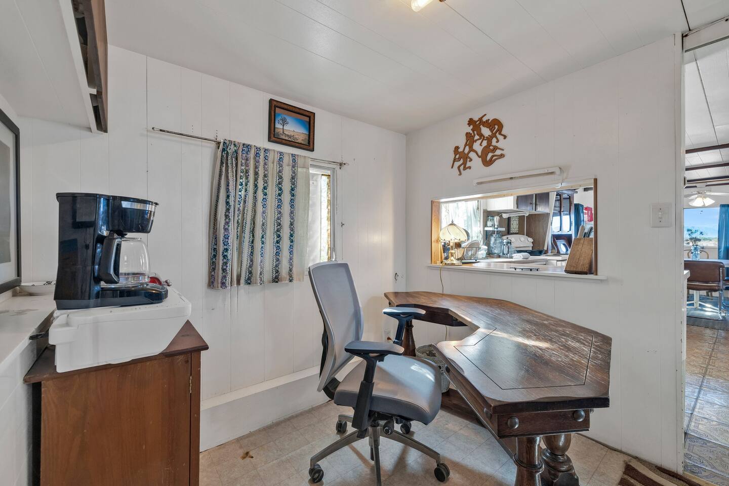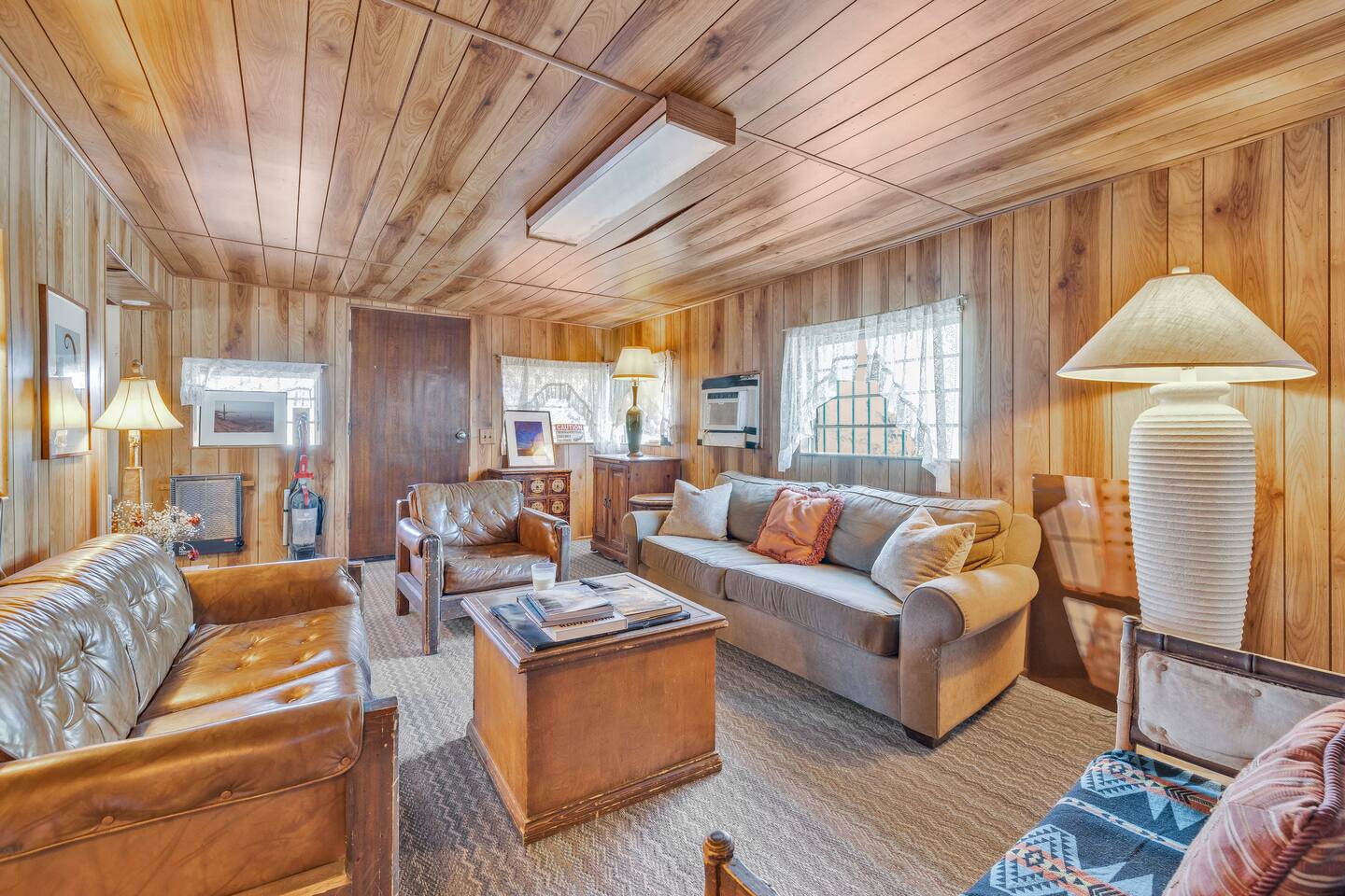 A kitsch-soaked hideaway in the post-apocalyptic wonderland of Bombay Beach: step inside The Palazzo, where roadside Americana meets desert surrealism. This one-bedroom retreat is drenched in charm and eccentricity: think leather club chairs, vintage lamps, wood paneling, and bold prints by the photographer-owner. The atmosphere is equal parts lodge, love letter, and Lynchian living room. Located at 1st Street and Avenue E—just five blocks from the ghostly shores of the Salton Sea—this fully air-conditioned home is your launchpad for exploring the strange sublime of the Imperial Valley: Salvation Mountain, Slab City, East Jesus, and the decaying glamour of Bombay Beach itself. Inside: • A queen bedroom with crisp linens and dreamcatchers above the bed • A spacious living room with two sofas, armchairs, a flatscreen TV, and glowing lamps for that golden-hour glow all night long • A dining nook that conjures 1970s supper club vibes • A stocked kitchen and a cozy office nook with an ergonomic chair for remote work or poetic musing • Lighting-fast WiFi, three cooling units, and a porch facing the train tracks for your daily fix of cinematic ambience The lot is fenced, pet-friendly, and private. But remember: Bombay Beach is more than a destination—it’s an art colony, social experiment, and poetic ruin. There’s no gas station. But there is magic.