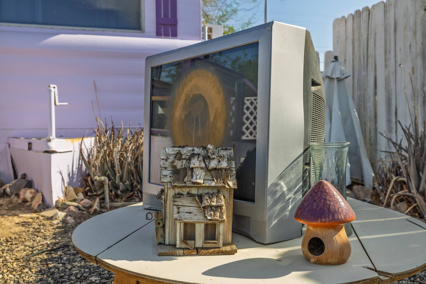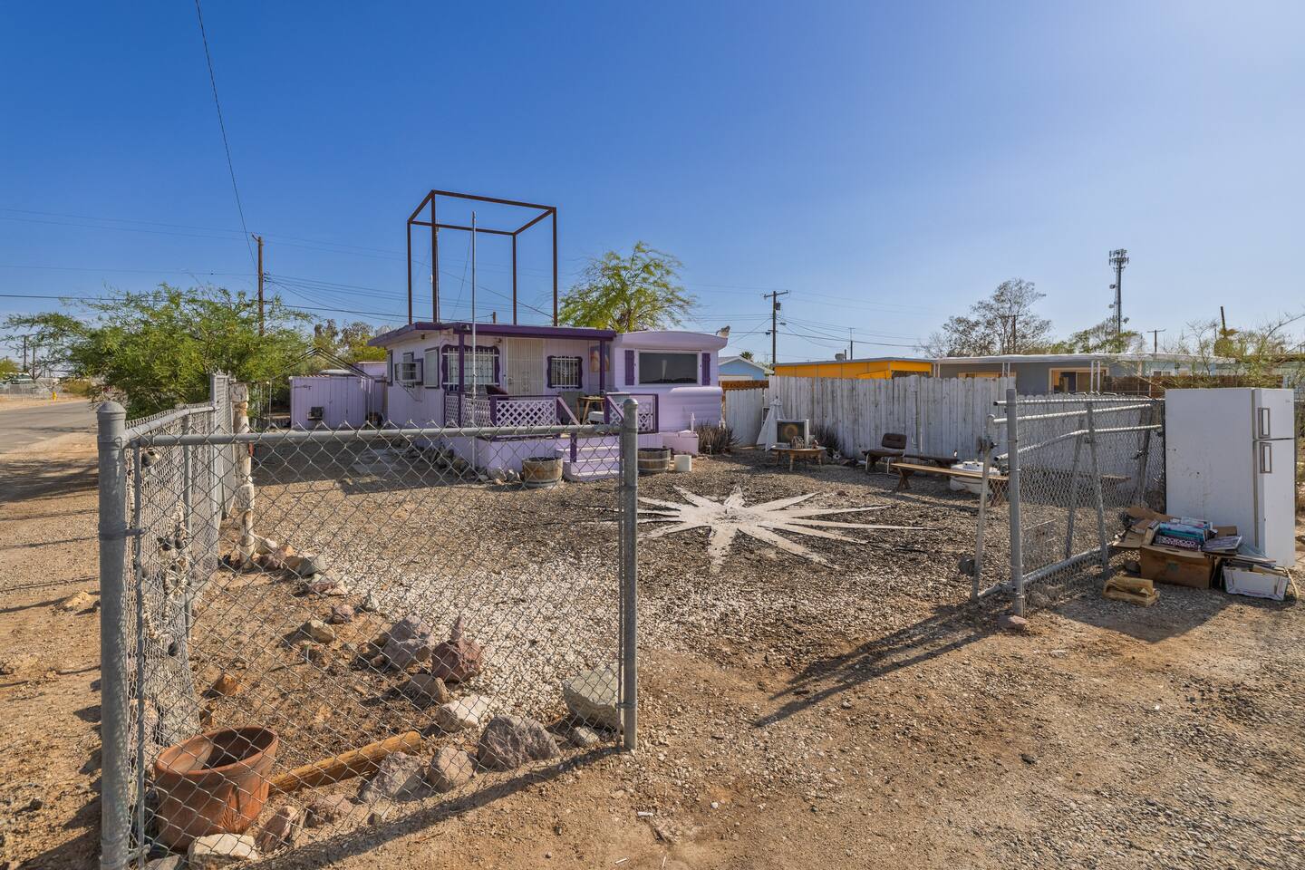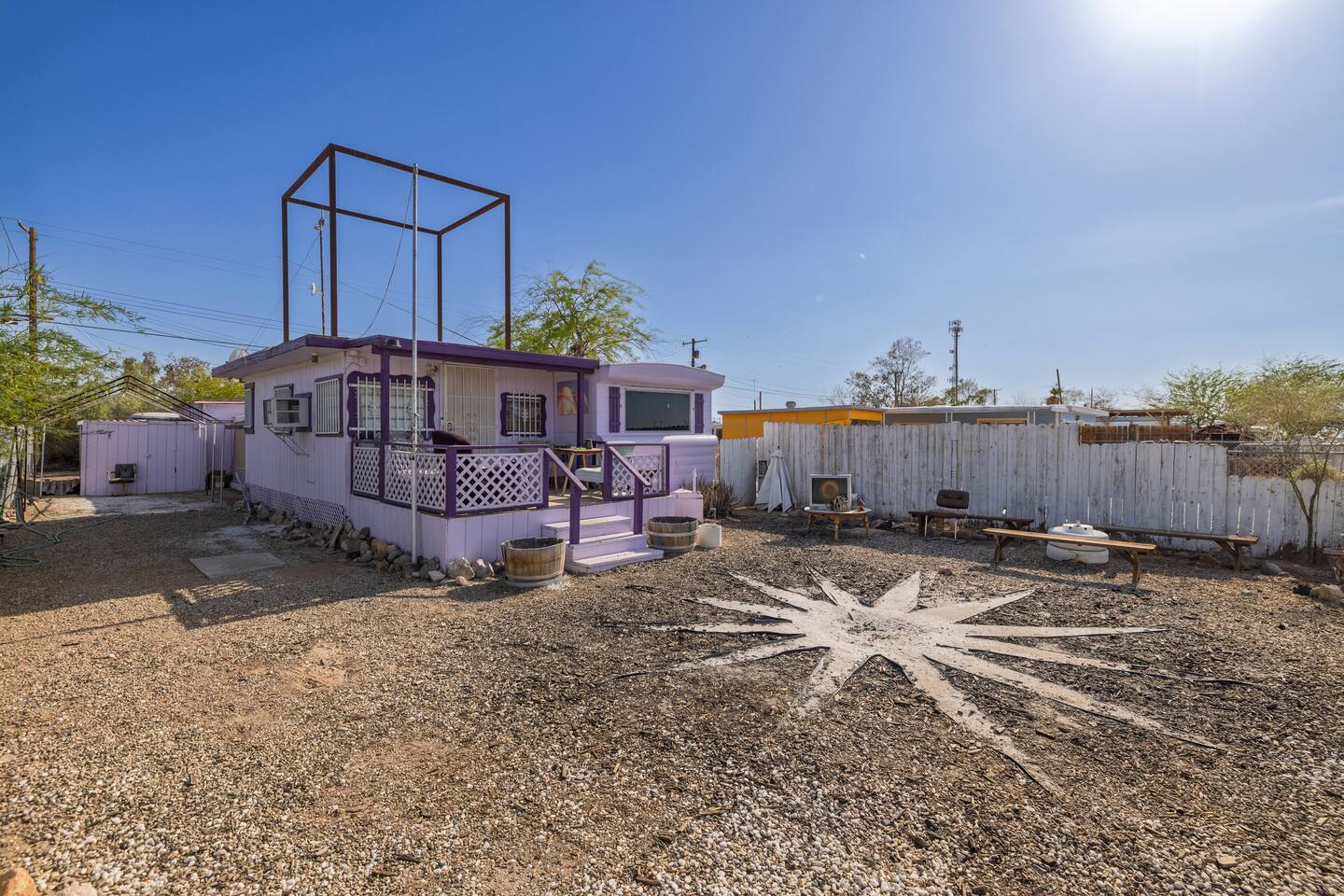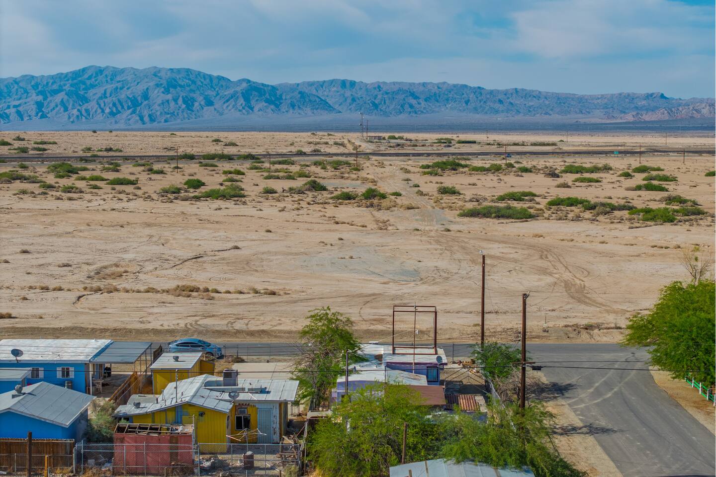 A playful, art-filled desert hideaway with lightning fast wifi, just steps from the shores of the Salton Sea. Located at 1st & Avenue E, The Palazzo features a brand-new queen bed, three powerful A/C units, and a flatscreen TV for cozy nights in. Relax on the front porch and watch the train roll by, or wander down E to catch the sunset at the water’s edge. Full of quirky charm and local color, it’s the perfect home base for exploring the magic of Bombay Beach and its legendary art scene.