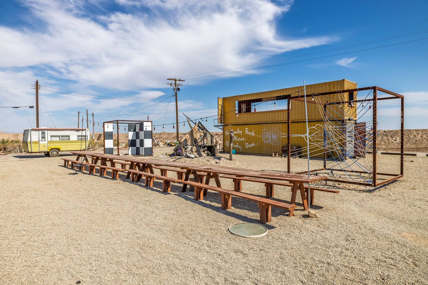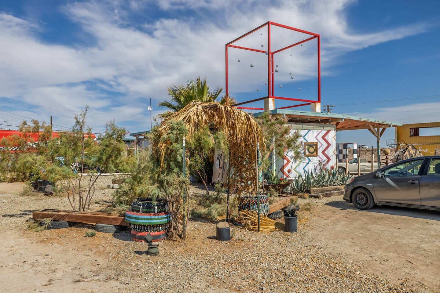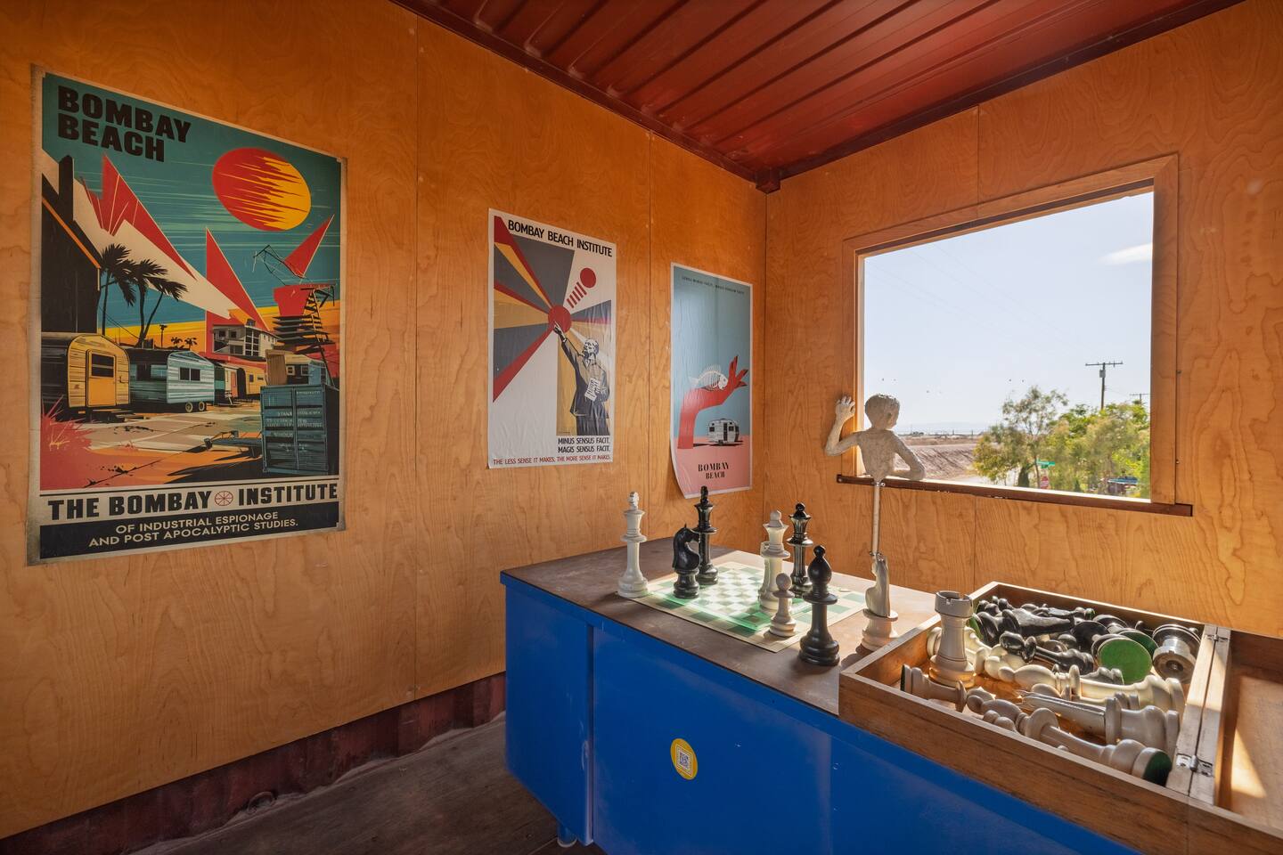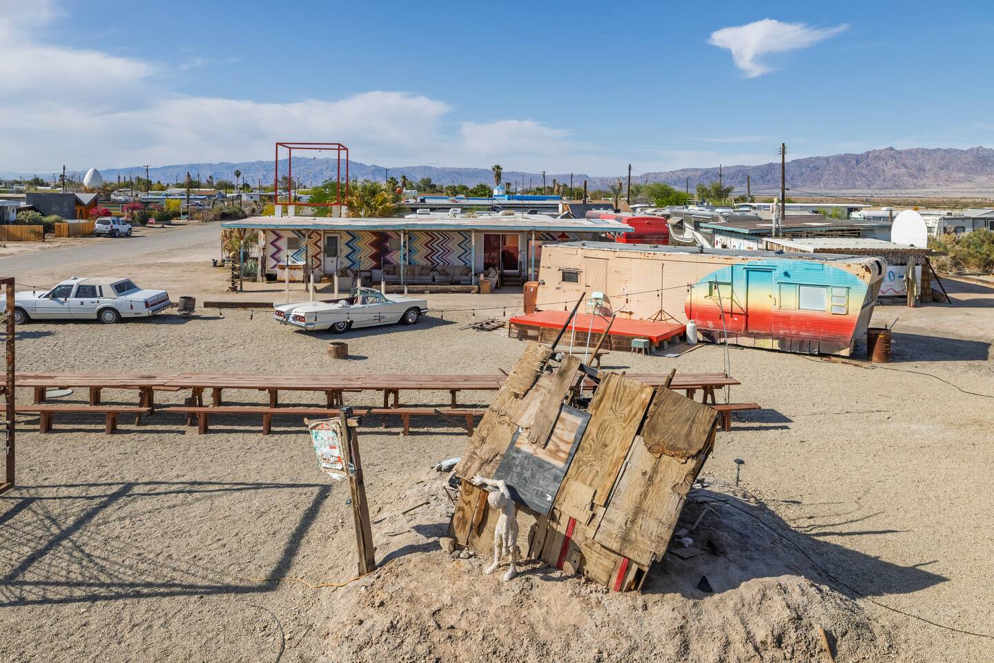 Welcome to Zig Zag Piazza A cornerstone of the Bombay Beach Biennale and a sanctuary for the strange and sublime, the Zig Zag House is part art installation, part desert residence, and part fever dream. Here, the air buzzes with creative static, and every wall, corner, and object seems to be involved in some kind of silent but sensual argument about the nature of reality. The 3-bedroom house includes: A spacious primary room with a queen bed Two smaller bedrooms with twin beds (ideal for groups of friends or collaborative thinkers) A living area where mid-century silhouettes mingle with organic textures and artful accents. A full kitchen for culinary experiments (no guarantees on results) Air conditioning, because you’re still human after all Throughout the space, you’ll encounter curated art exhibits that may change periodically. Outside A full outdoor kitchen, perfect for hosting small events. Please inquire about event pricing. A spacious patio with two large couches for lounging and socializing. Zig Zag Piazza — home to an eclectic sculpture garden, the Bombay Beach Museum of Bombay Beach, a 60-person outdoor dining table, a small stage, and open-air hang space. Just blocks from the Salton Sea and surrounded by the weird and wonderful fabric of Bombay Beach — including The Institute Gardens, the Drive-In, and other legendary installations — ZigZag offers not just a place to sleep, but a permission slip to lose your mind a little, and maybe come back with something better. Come prepared to be bewildered. Come with wine. Come with friends who ask big questions and laugh at strange times. The desert will do the rest.