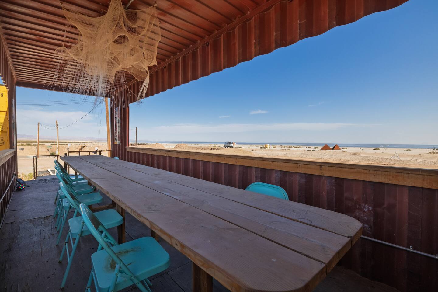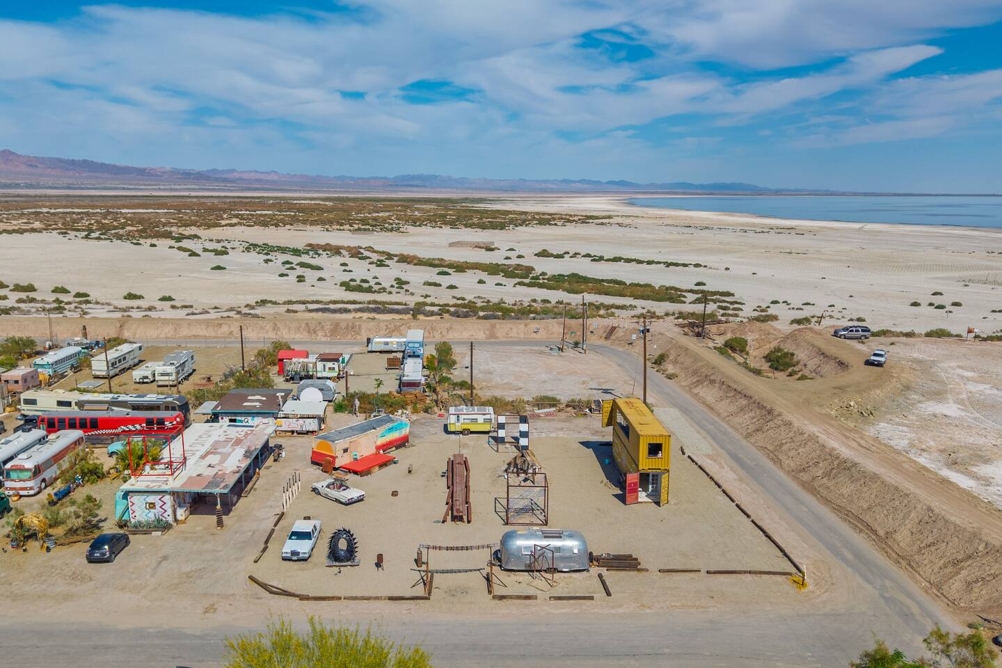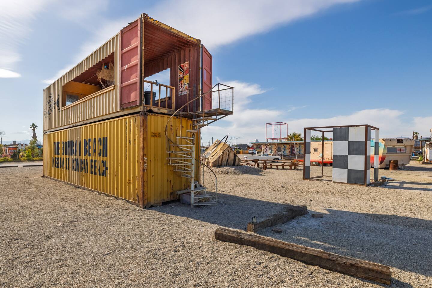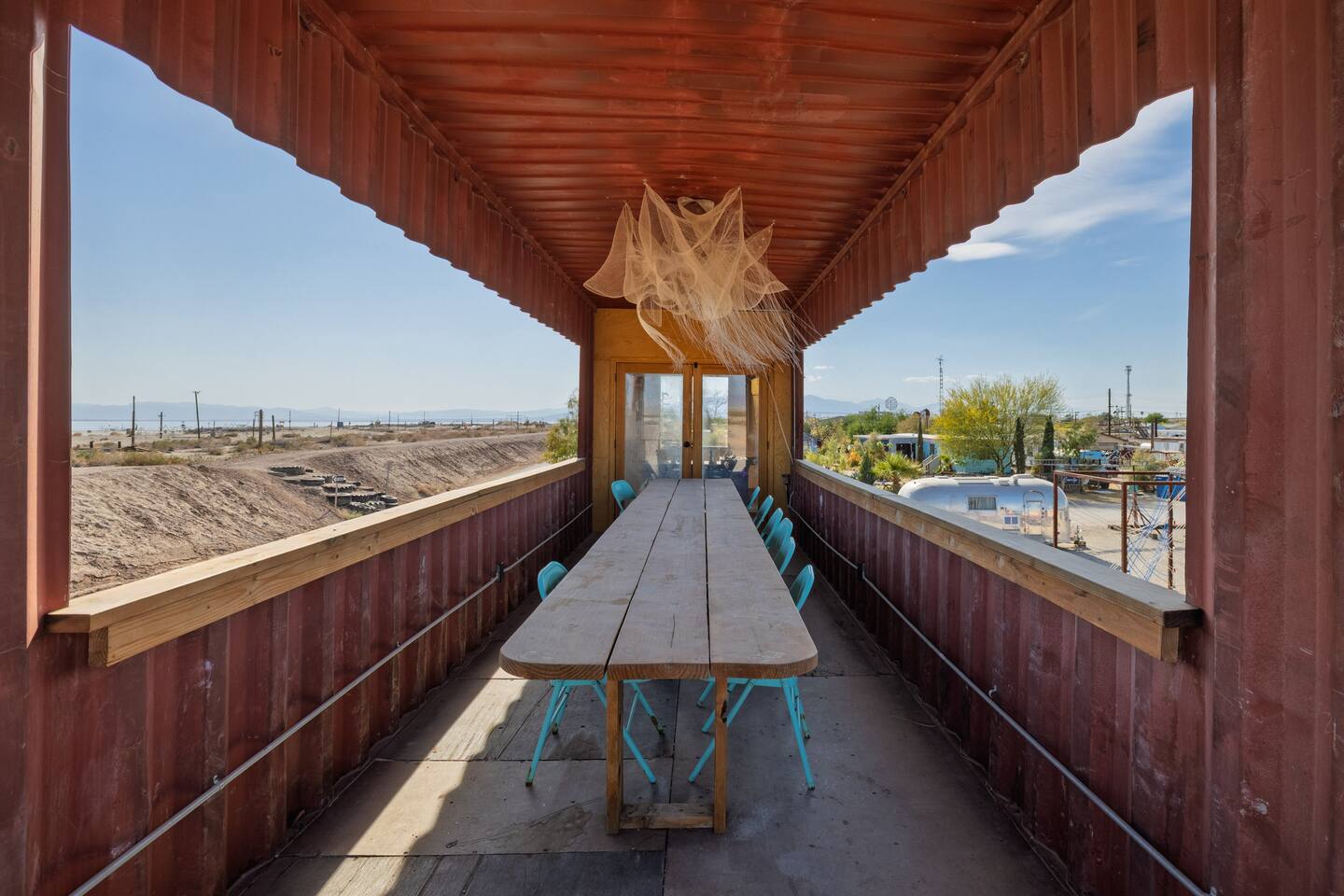 A bold, art-forward retreat in the heart of Bombay Beach. The Zigzag House features a full bed and two twins, full kitchen, A/C, and oversized outdoor hang space with four huge couches. Right outside, you'll find Zig Zag Piazza — home to an eclectic sculpture garden, the Bombay Beach Museum of Bombay Beach, a 60-person outdoor dining table, full outdoor kitchen, and open-air hang space. Steps from the Salton Sea and local art sites. Perfect for dreamers, artists, and desert adventurers.