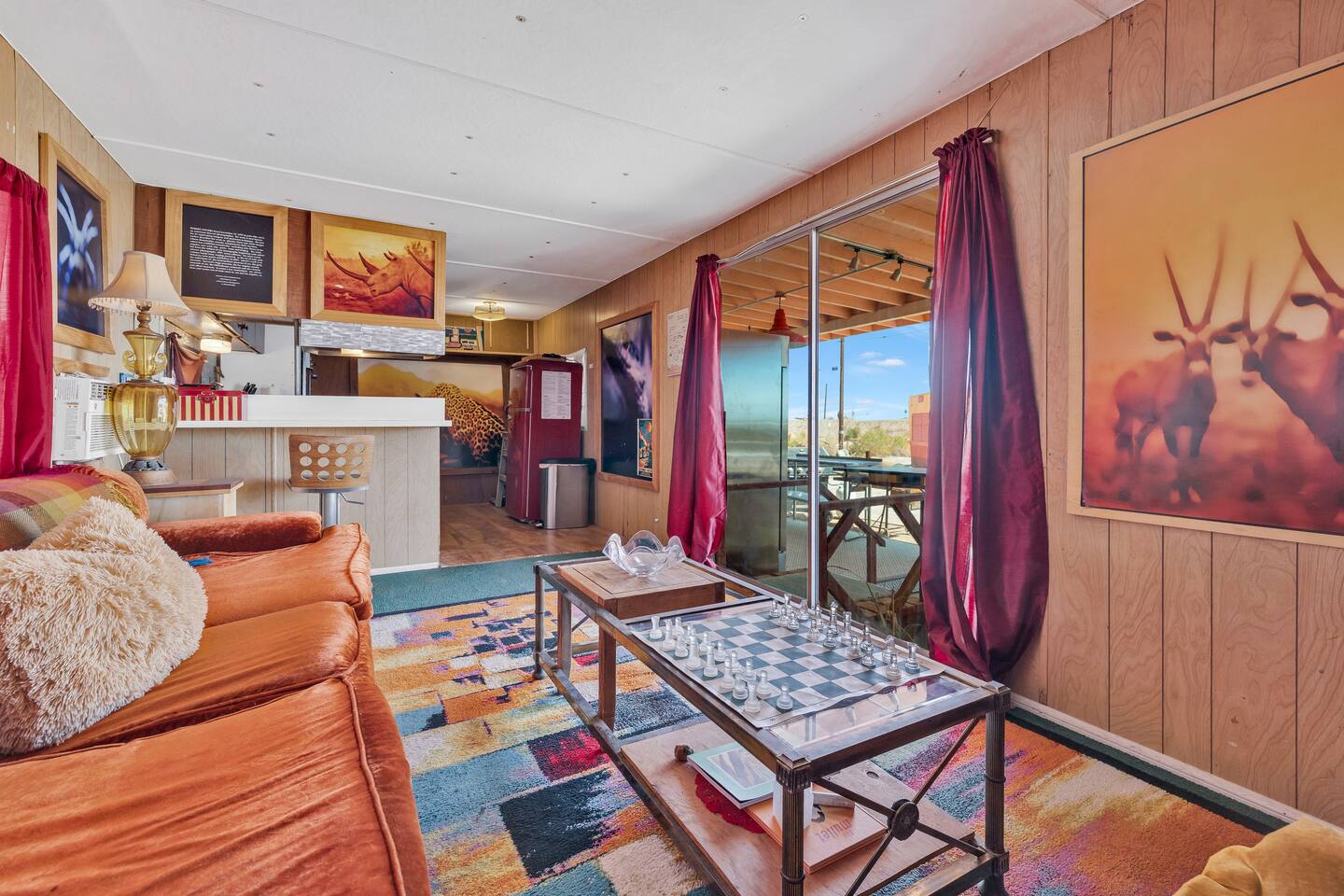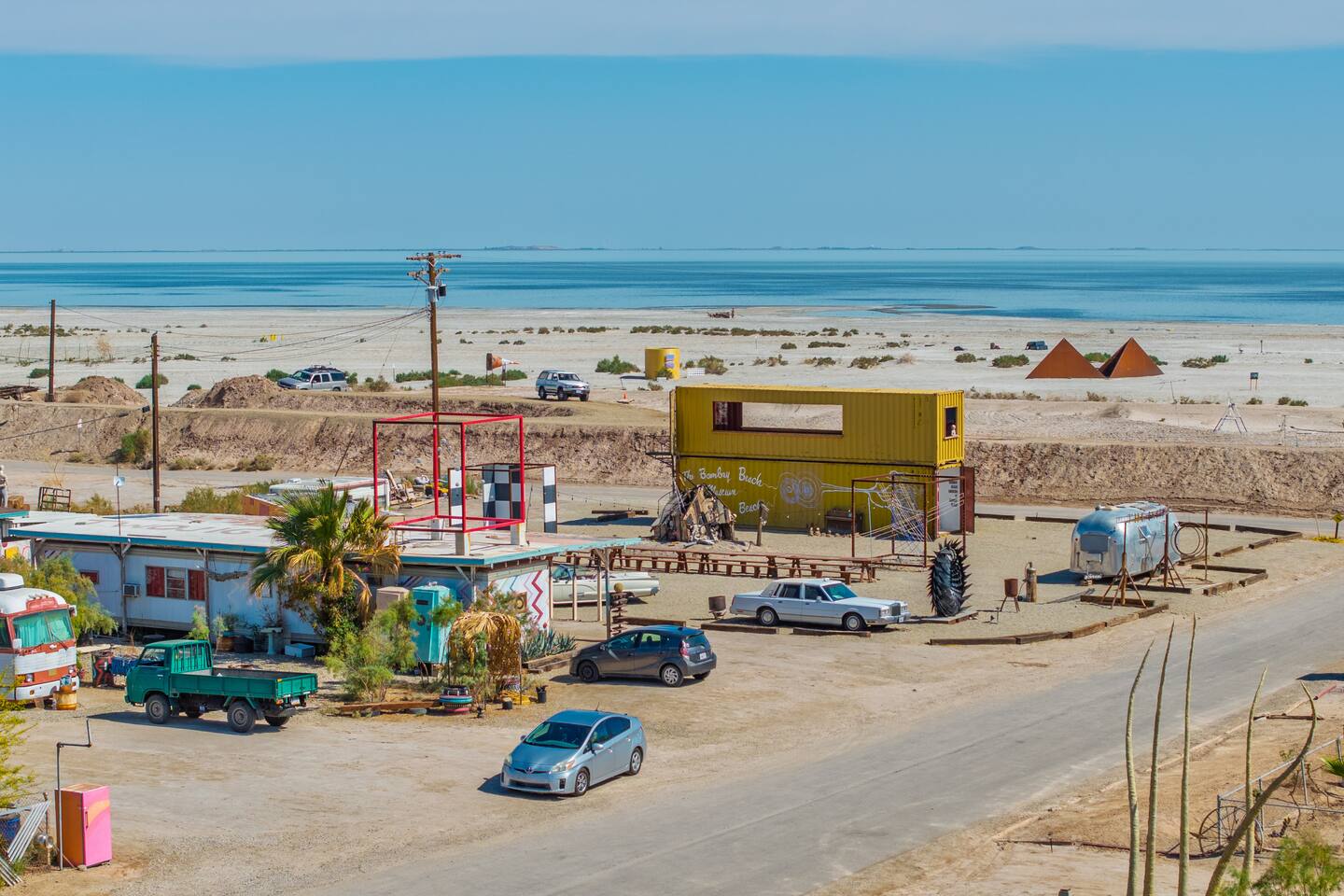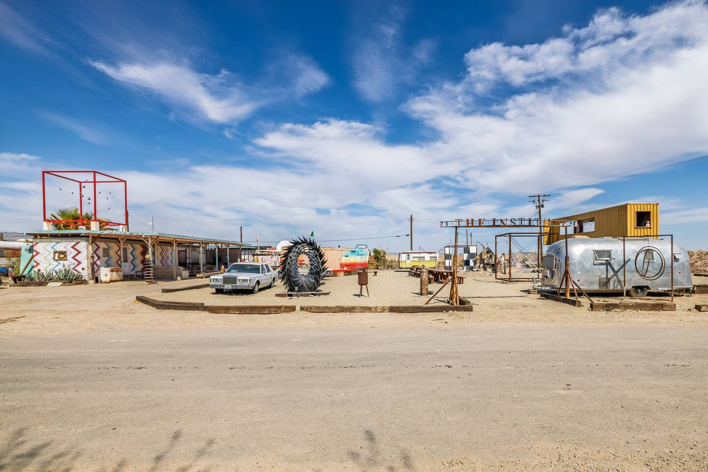 A bold, art-forward retreat in the heart of Bombay Beach. The Zigzag House features a full bed and two twins, full kitchen, A/C, and oversized outdoor hang space with four huge couches. Right outside, you'll find Zig Zag Piazza — home to an eclectic sculpture garden, the Bombay Beach Museum of Bombay Beach, a 60-person outdoor dining table, full outdoor kitchen, and open-air hang space. Steps from the Salton Sea and local art sites. Perfect for dreamers, artists, and desert adventurers.