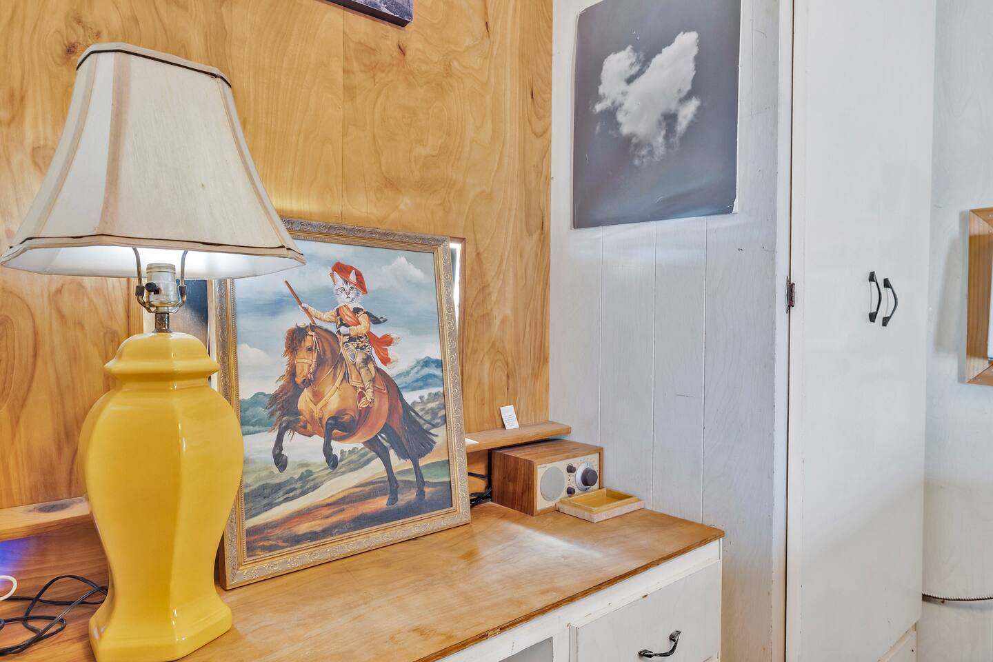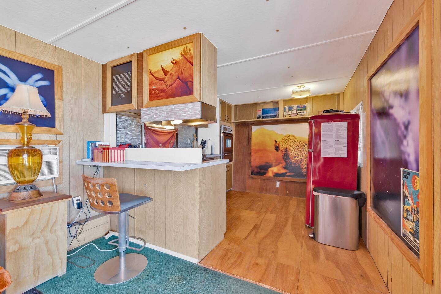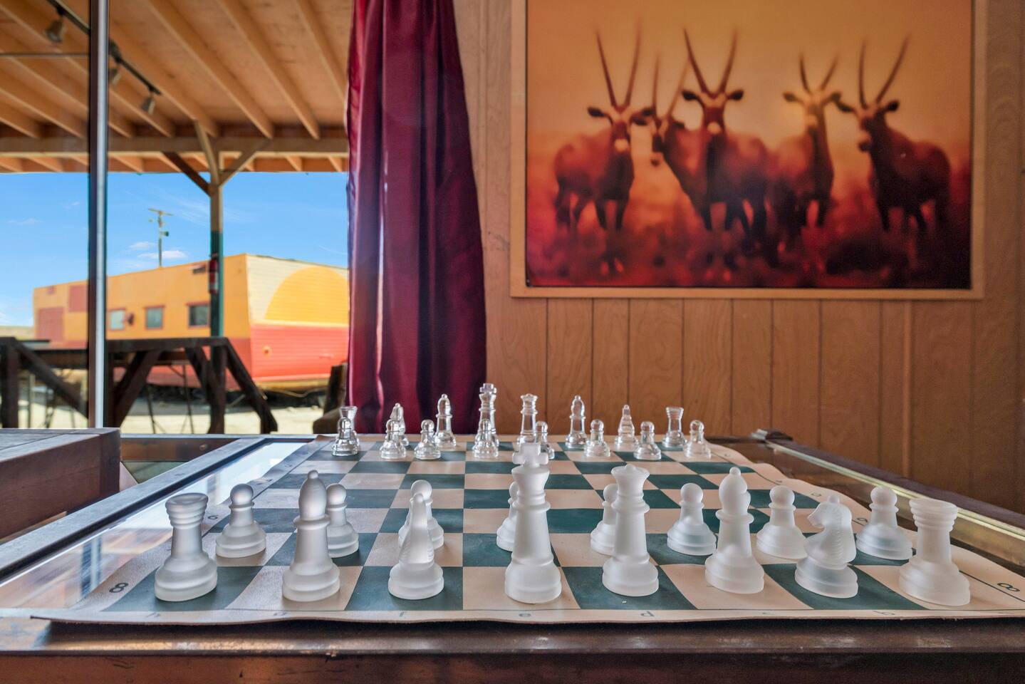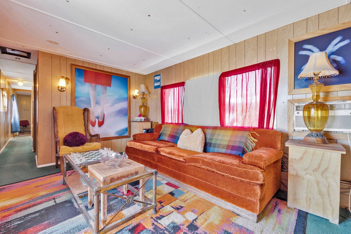 A bold, art-forward retreat in the heart of Bombay Beach. The Zigzag House features a full bed and two twins, full kitchen, A/C, and oversized outdoor hang space with four huge couches. Right outside, you'll find Zig Zag Piazza — home to an eclectic sculpture garden, the Bombay Beach Museum of Bombay Beach, a 60-person outdoor dining table, full outdoor kitchen, and open-air hang space. Steps from the Salton Sea and local art sites. Perfect for dreamers, artists, and desert adventurers.